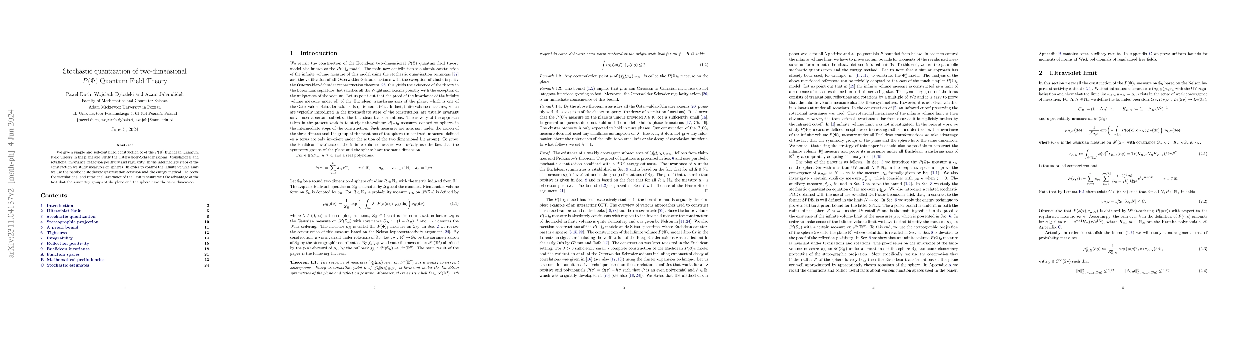 We give a simple and self-contained construction of of the $P(\Phi)$ Euclidean Quantum Field Theory in the plane and verify the Osterwalder-Schrader axioms: translational and rotational invariance, reflection positivity and regularity. In the intermediate steps of the construction we study measures on spheres. In order to control the infinite volume limit we use the parabolic stochastic quantization equation and the energy method. To prove the translational and rotational invariance of the limit measure we take advantage of the fact that the symmetry groups of the plane and the sphere have the same dimension.