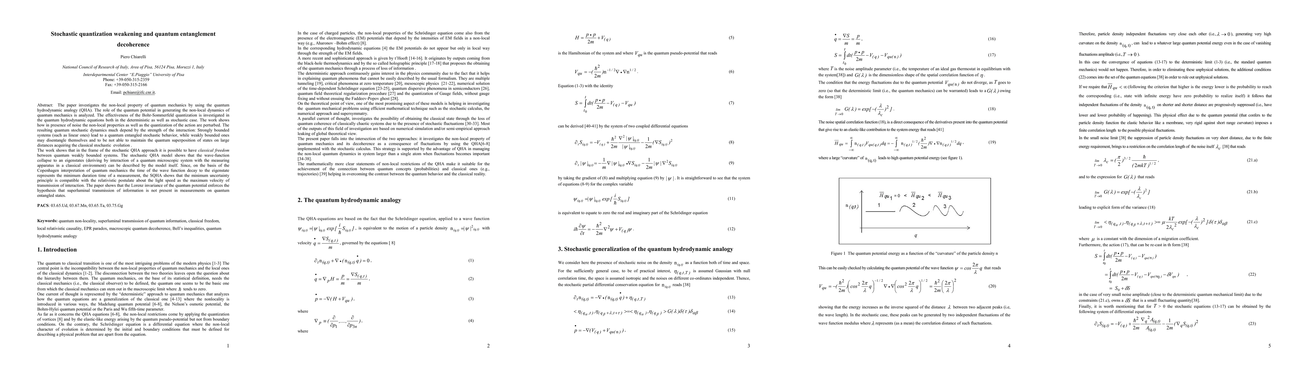 The paper investigates the non-local property of quantum mechanics in the quantum hydrodynamic analogy (QHA) given by Madelung. The role of the quantum potential in generating the non-local dynamics of quantum mechanics is analyzed. The work shows how in presence of noise the non-local properties as well as the quantization of the action are perturbed. The resulting stochastic QHA dynamics much depend by the strength of the interaction: Strongly bounded systems (such as linear ones) lead to quantum entangled stochastic behavior, while weakly bounded ones may be not able to maintain the quantum superposition of states on large distances and may loose their macro-scale quantum coherence acquiring the classical stochastic evolution . The work shows that in the frame of the stochastic approach it is possible to have freedom between quantum weakly bounded systems. The stochastic QHA model shows that the wave-function collapse to an eigenstates (deriving by interaction of a quantum microscopic system with a classical (macroscopic) one) can be described by the model itself as a kinetic quantum (relaxation) process to a stationary state. Since the time of the wave function decay to the eigenstate represents the minimum duration time of a measurement, the minimum uncertainty principle is shown to be compatible with the relativistic postulate about the light speed as the maximum velocity of transmission of interaction. About this topic, the paper shows that the Lorenz invariance of the relativistic quantum potential (coming from the Dirac equation) enforces the hypothesis that the superluminal transmission of information are not present in measurements on quantum entangled state.