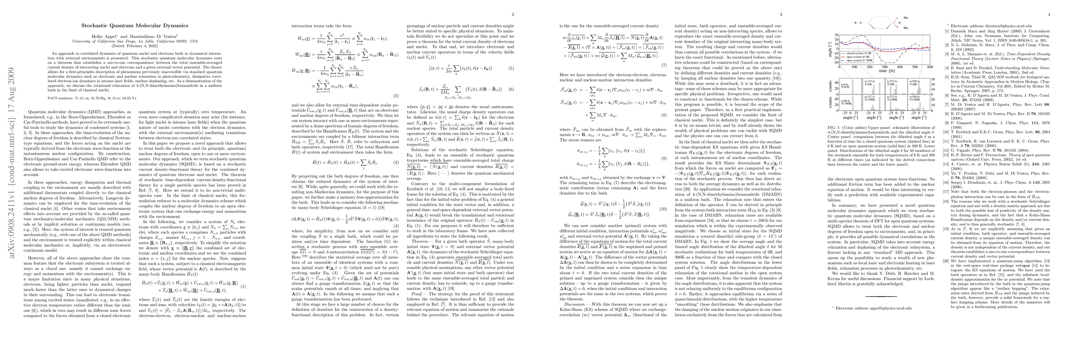 This paper introduces a stochastic quantum molecular dynamics framework that correlates quantum nuclei and electrons interacting with external environments. It establishes a theoretical basis for first-principles analysis of phenomena like electronic and nuclear relaxation, and demonstrates its application through the rotational relaxation of a specific molecule in a classical nuclei context.