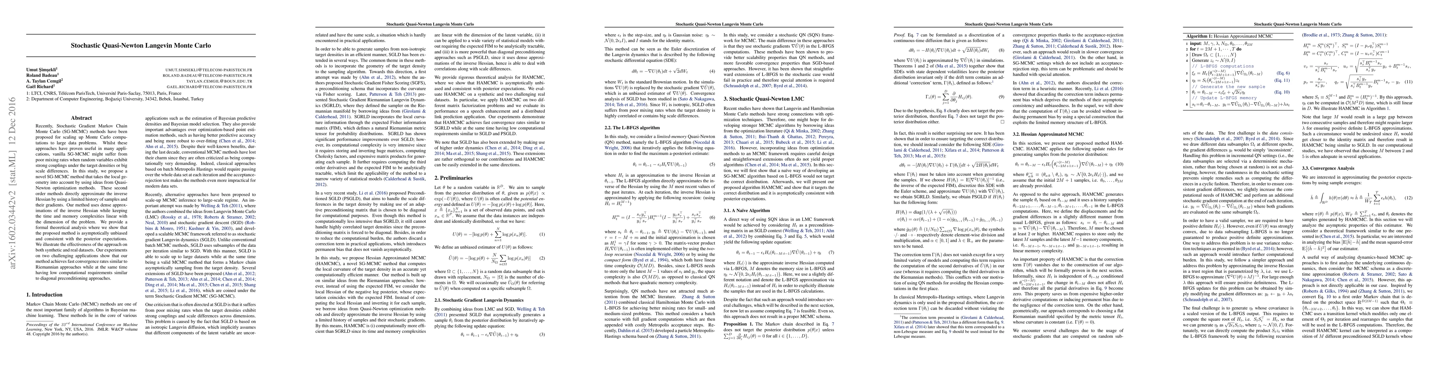 This paper proposes a novel Stochastic Quasi-Newton Langevin Monte Carlo method that enhances the efficiency of Stochastic Gradient Markov Chain Monte Carlo for large data problems by incorporating Quasi-Newton optimization techniques to account for local geometry. The method achieves fast convergence and maintains low computational complexity, demonstrated through theoretical analysis and empirical results on synthetic and real datasets.