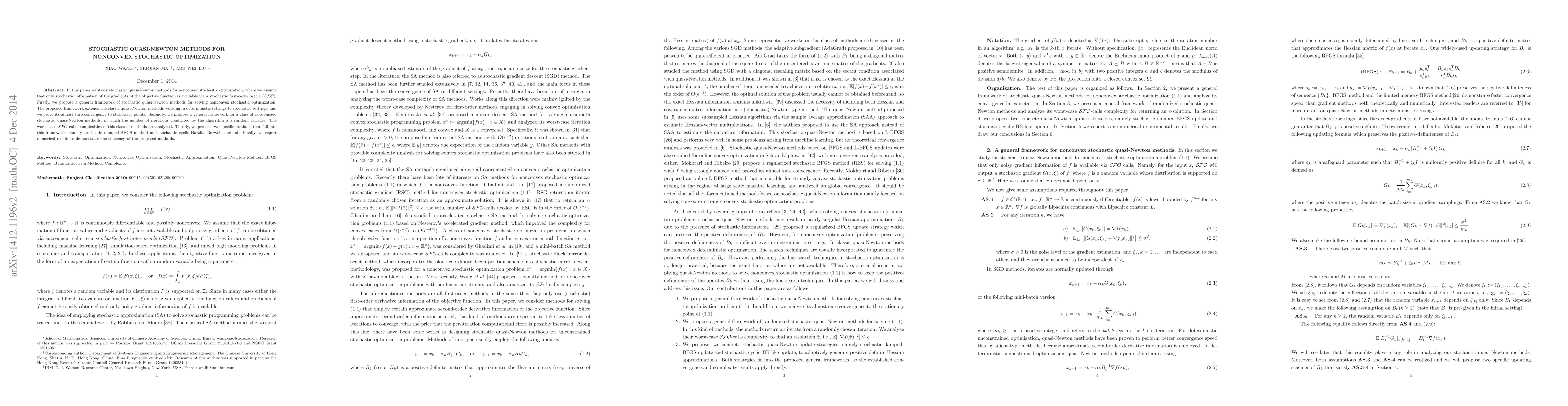 This paper explores stochastic quasi-Newton methods for nonconvex stochastic optimization, proposing a framework that extends classic quasi-Newton methods to stochastic settings and proving almost sure convergence. It also introduces a class of randomized methods with analyzed complexities and presents two specific methods, concluding with numerical results demonstrating their efficiency.