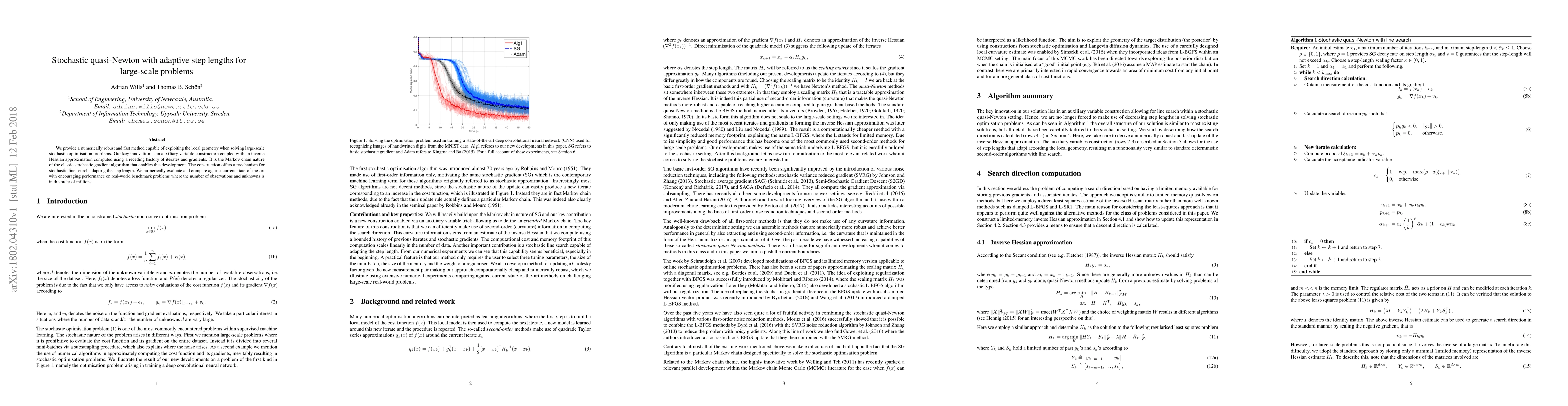 We provide a numerically robust and fast method capable of exploiting the local geometry when solving large-scale stochastic optimisation problems. Our key innovation is an auxiliary variable construction coupled with an inverse Hessian approximation computed using a receding history of iterates and gradients. It is the Markov chain nature of the classic stochastic gradient algorithm that enables this development. The construction offers a mechanism for stochastic line search adapting the step length. We numerically evaluate and compare against current state-of-the-art with encouraging performance on real-world benchmark problems where the number of observations and unknowns is in the order of millions.