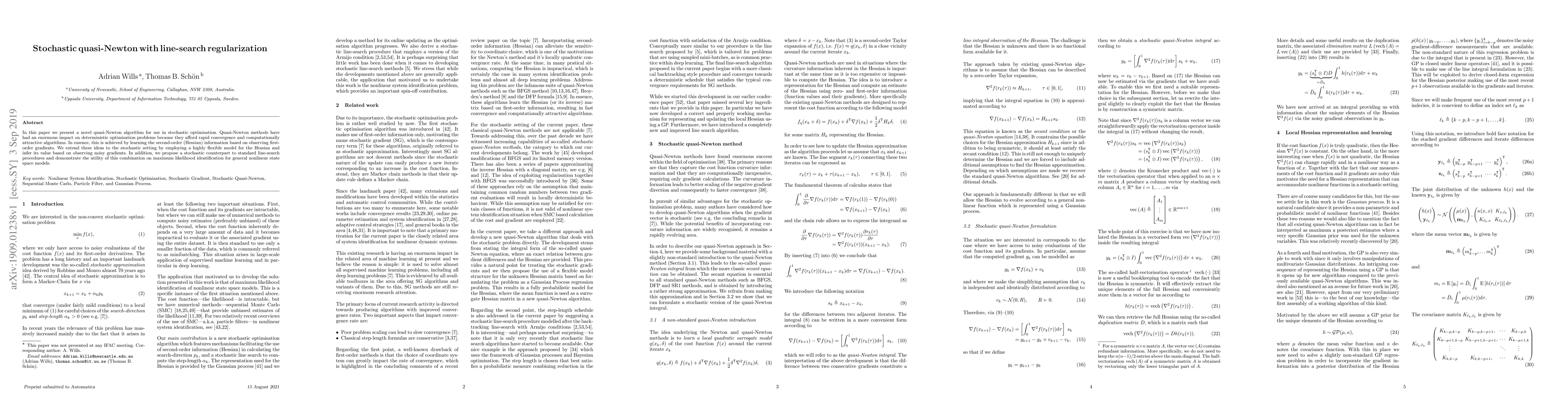 In this paper we present a novel quasi-Newton algorithm for use in stochastic optimisation. Quasi-Newton methods have had an enormous impact on deterministic optimisation problems because they afford rapid convergence and computationally attractive algorithms. In essence, this is achieved by learning the second-order (Hessian) information based on observing first-order gradients. We extend these ideas to the stochastic setting by employing a highly flexible model for the Hessian and infer its value based on observing noisy gradients. In addition, we propose a stochastic counterpart to standard line-search procedures and demonstrate the utility of this combination on maximum likelihood identification for general nonlinear state space models.