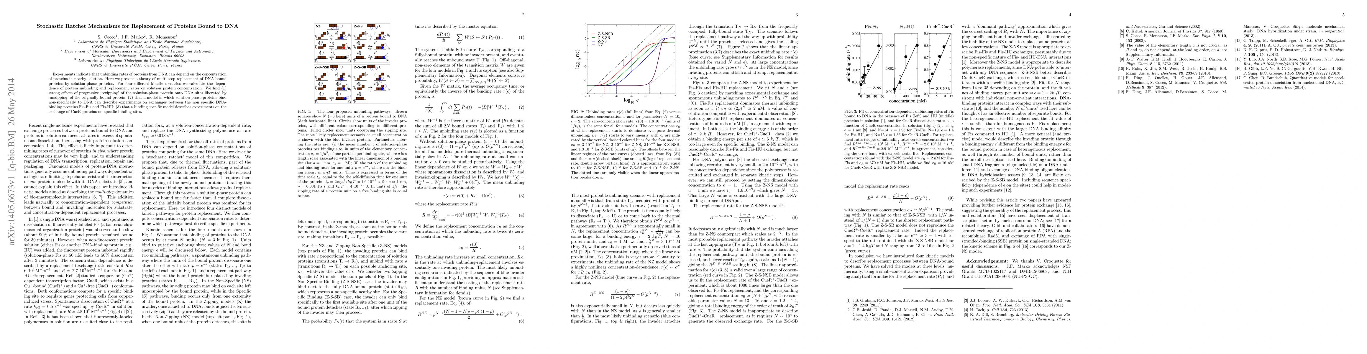 This paper develops a theoretical framework for understanding the multi-step replacement of DNA-bound proteins by solution-phase proteins, showing strong effects of 'rezipping' and demonstrating that both non-specific and specific binding models can describe observed protein exchange behaviors. The study identifies the dependency of protein unbinding and replacement rates on solution protein concentration across four kinetic scenarios.