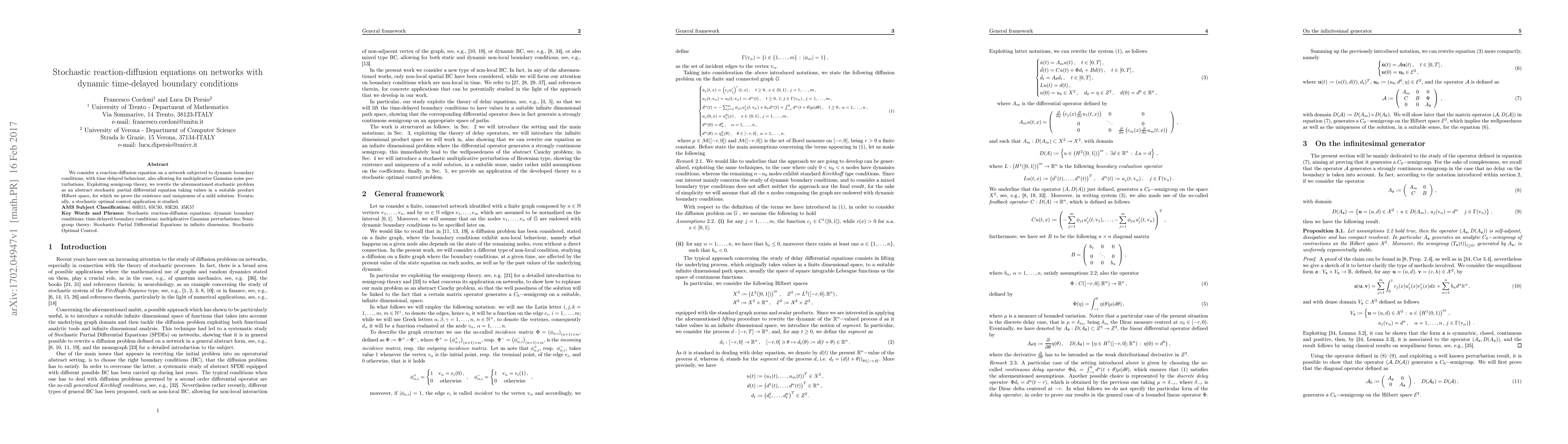 This paper studies stochastic reaction-diffusion equations on networks with dynamic time-delayed boundary conditions, incorporating multiplicative Gaussian noise. Using semigroup theory, it reformulates the problem as an abstract stochastic partial differential equation, proving existence and uniqueness of a mild solution, and explores its application in stochastic optimal control.