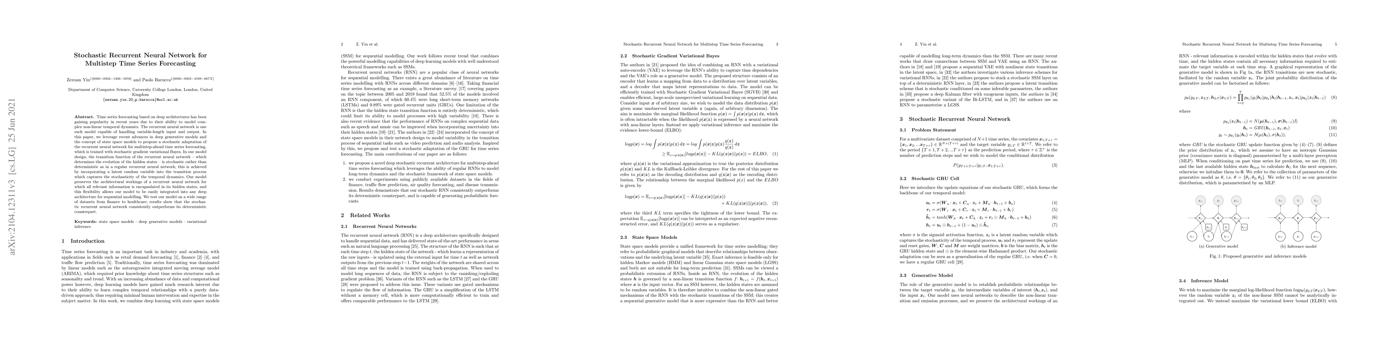 This paper proposes a stochastic recurrent neural network for multistep time series forecasting, incorporating a latent random variable into the transition function to capture temporal dynamics' stochasticity. The model is trained with stochastic gradient variational Bayes and outperforms deterministic counterparts across various datasets.
