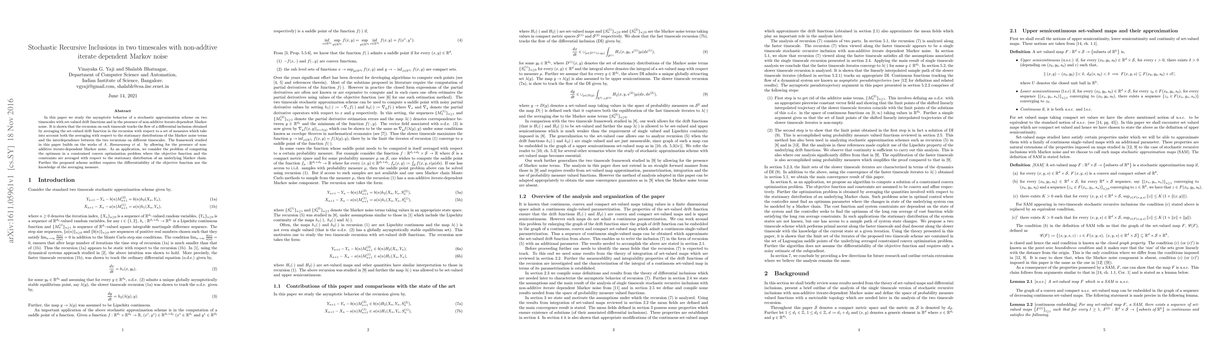 In this paper we study the asymptotic behavior of a stochastic approximation scheme on two timescales with set-valued drift functions and in the presence of non-additive iterate-dependent Markov noise. It is shown that the recursion on each timescale tracks the flow of a differential inclusion obtained by averaging the set-valued drift function in the recursion with respect to a set of measures which take into account both the averaging with respect to the stationary distributions of the Markov noise terms and the interdependence between the two recursions on different timescales. The framework studied in this paper builds on the works of \it{A. Ramaswamy et al. }\rm by allowing for the presence of non-additive iterate-dependent Markov noise. As an application, we consider the problem of computing the optimum in a constrained convex optimization problem where the objective function and the constraints are averaged with respect to the stationary distribution of an underlying Markov chain. Further the proposed scheme neither requires the differentiability of the objective function nor the knowledge of the averaging measure.