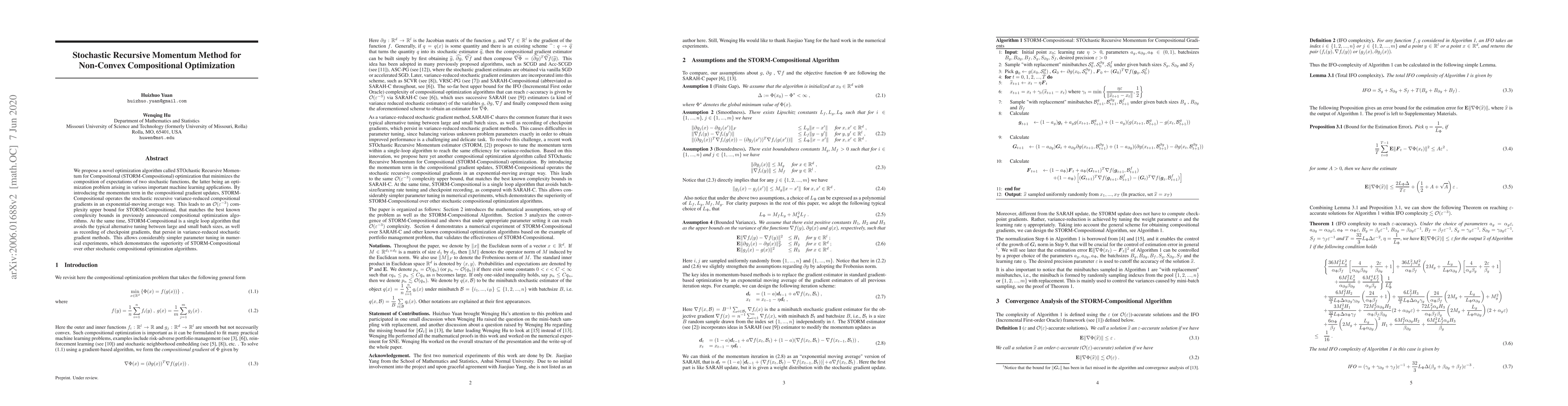 The paper introduces STORM-Compositional, a novel stochastic optimization algorithm that efficiently minimizes the composition of expectations of two stochastic functions, achieving an $O(\varepsilon^{-3})$ complexity upper bound. It simplifies parameter tuning by avoiding batch size tuning and gradient checkpointing, demonstrating superior performance over existing methods.