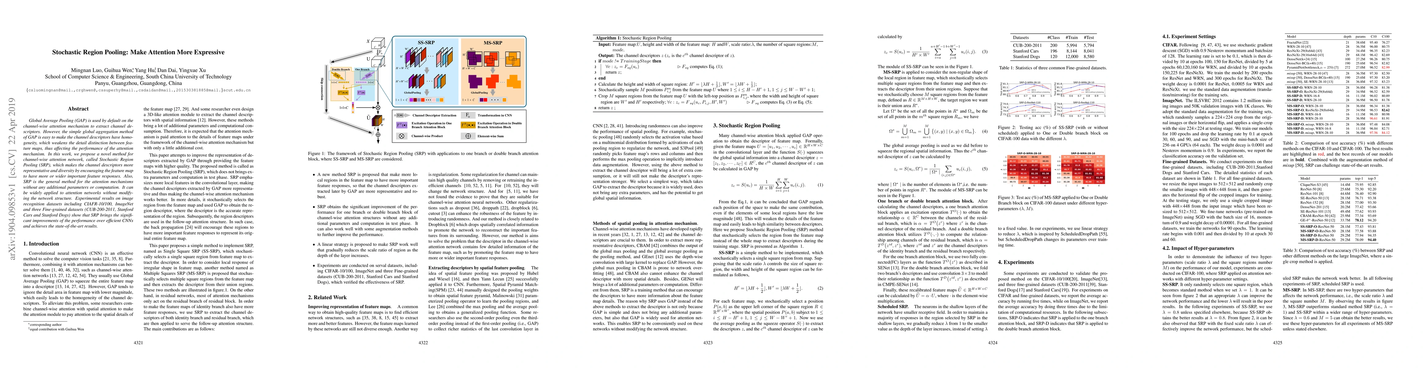 The paper presents Stochastic Region Pooling (SRP), a novel method for channel-wise attention networks that stochastically selects regions from feature maps to extract descriptors, improving the representation of channel descriptors and promoting the network to focus on more and wider spatially distributed regions.