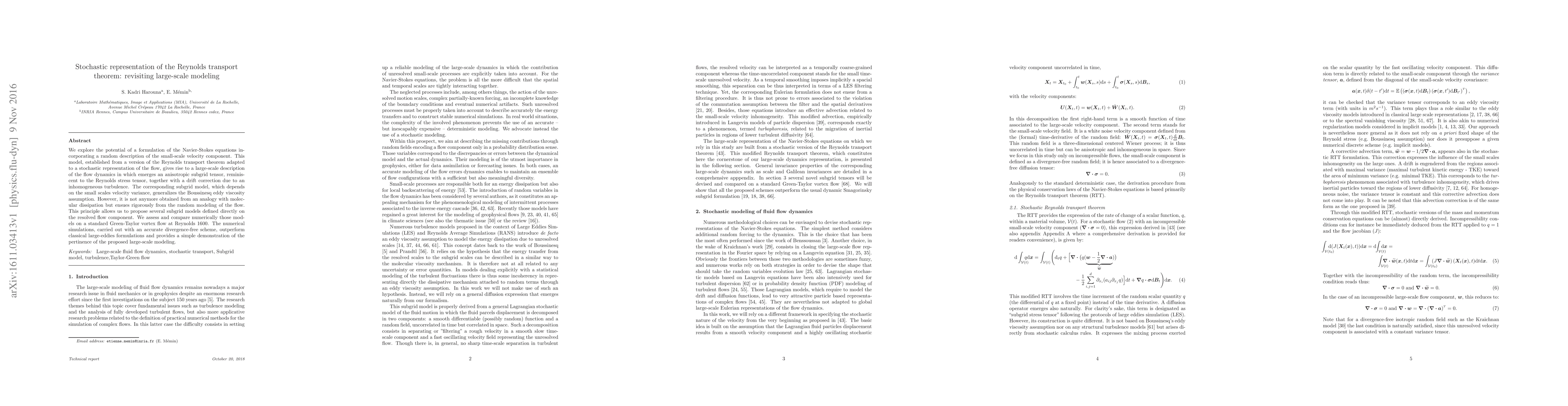 We explore the potential of a formulation of the Navier-Stokes equations incorporating a random description of the small-scale velocity component. This model, established from a version of the Reynolds transport theorem adapted to a stochastic representation of the flow, gives rise to a large-scale description of the flow dynamics in which emerges an anisotropic subgrid tensor, reminiscent to the Reynolds stress tensor, together with a drift correction due to an inhomogeneous turbulence. The corresponding subgrid model, which depends on the small scales velocity variance, generalizes the Boussinesq eddy viscosity assumption. However, it is not anymore obtained from an analogy with molecular dissipation but ensues rigorously from the random modeling of the flow. This principle allows us to propose several subgrid models defined directly on the resolved flow component. We assess and compare numerically those models on a standard Green-Taylor vortex flow at Reynolds 1600. The numerical simulations, carried out with an accurate divergence-free scheme, outperform classical large-eddies formulations and provides a simple demonstration of the pertinence of the proposed large-scale modeling.