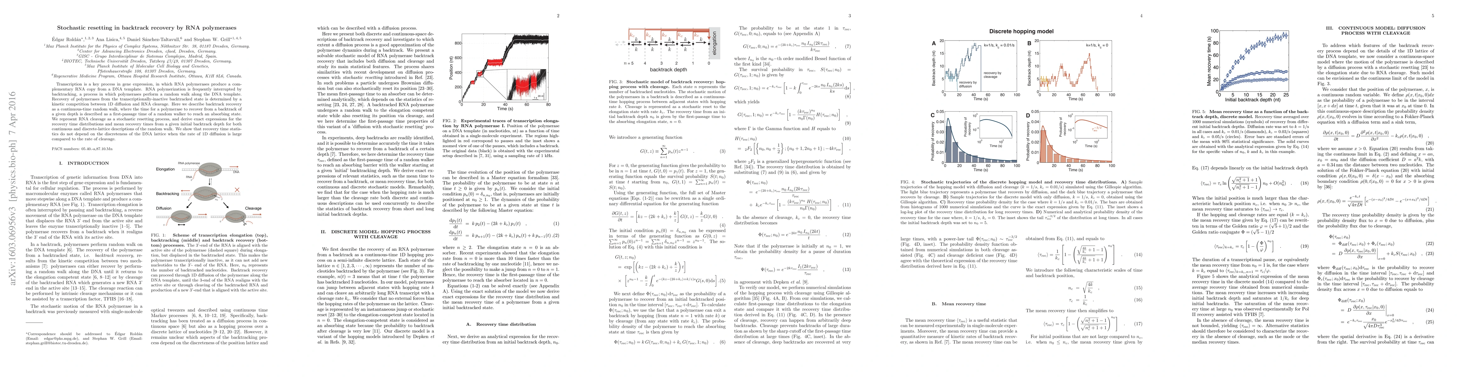 This paper investigates the stochastic resetting mechanism in RNA polymerase recovery from backtracking during transcription, modeling it as a continuous-time random walk. It derives expressions for recovery time distributions and mean recovery times, demonstrating that recovery time statistics are largely unaffected by the discreteness of the DNA lattice when diffusion is dominant.