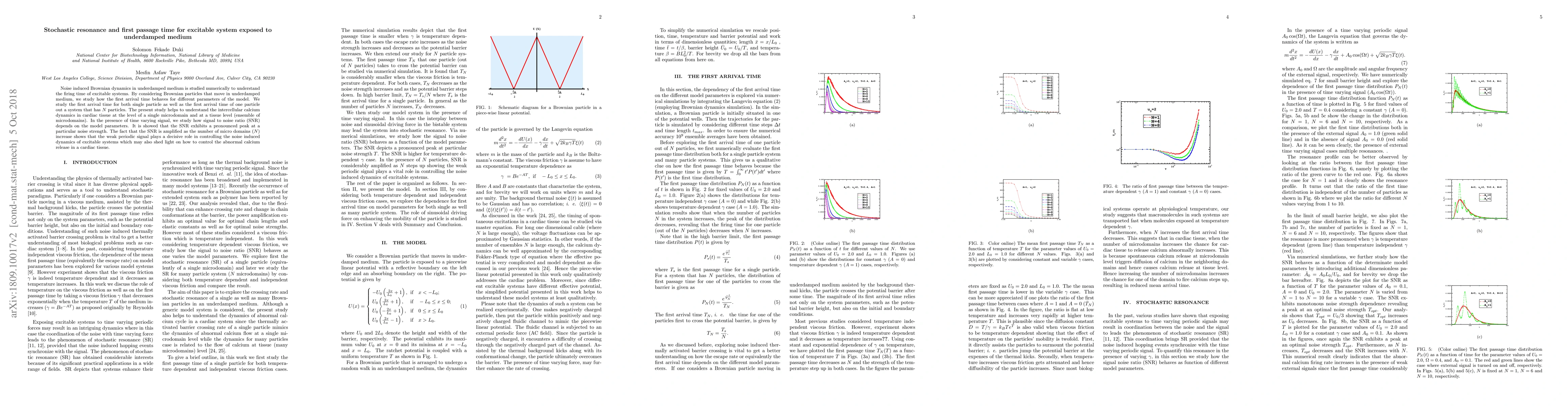 This paper numerically investigates noise-induced dynamics in underdamped mediums to understand excitable system firing times, focusing on first passage time for both single and multiple particles. It reveals that signal-to-noise ratio peaks at specific noise levels, indicating stochastic resonance's role in controlling calcium dynamics in cardiac tissue.