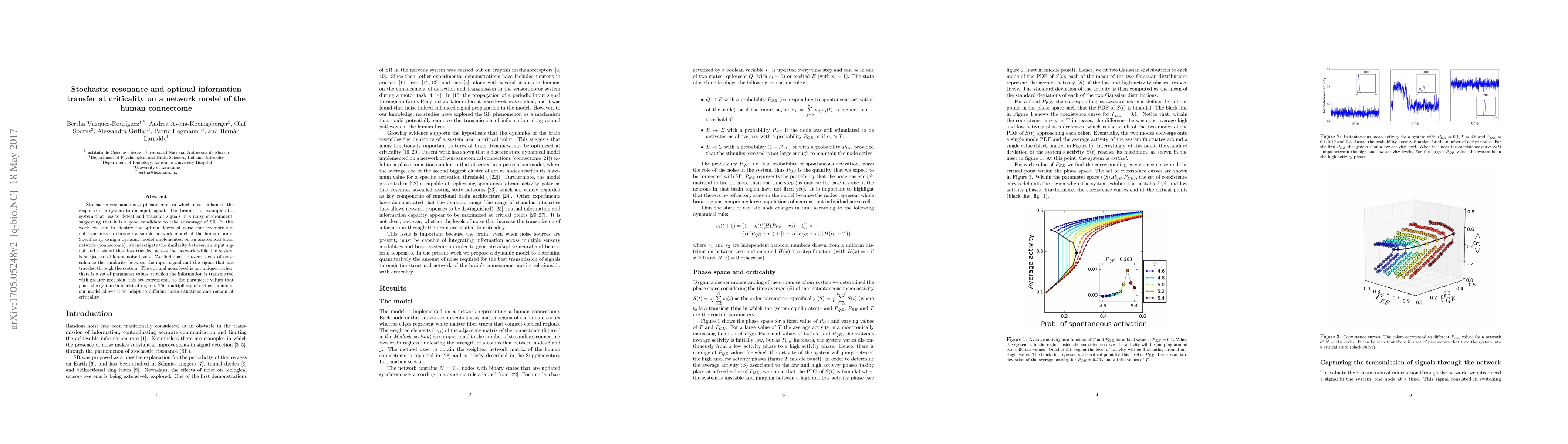 Stochastic resonance is a phenomenon in which noise enhances the response of a system to an input signal. The brain is an example of a system that has to detect and transmit signals in a noisy environment, suggesting that it is a good candidate to take advantage of SR. In this work, we aim to identify the optimal levels of noise that promote signal transmission through a simple network model of the human brain. Specifically, using a dynamic model implemented on an anatomical brain network (connectome), we investigate the similarity between an input signal and a signal that has traveled across the network while the system is subject to different noise levels. We find that non-zero levels of noise enhance the similarity between the input signal and the signal that has traveled through the system. The optimal noise level is not unique; rather, there is a set of parameter values at which the information is transmitted with greater precision, this set corresponds to the parameter values that place the system in a critical regime. The multiplicity of critical points in our model allows it to adapt to different noise situations and remain at criticality.
