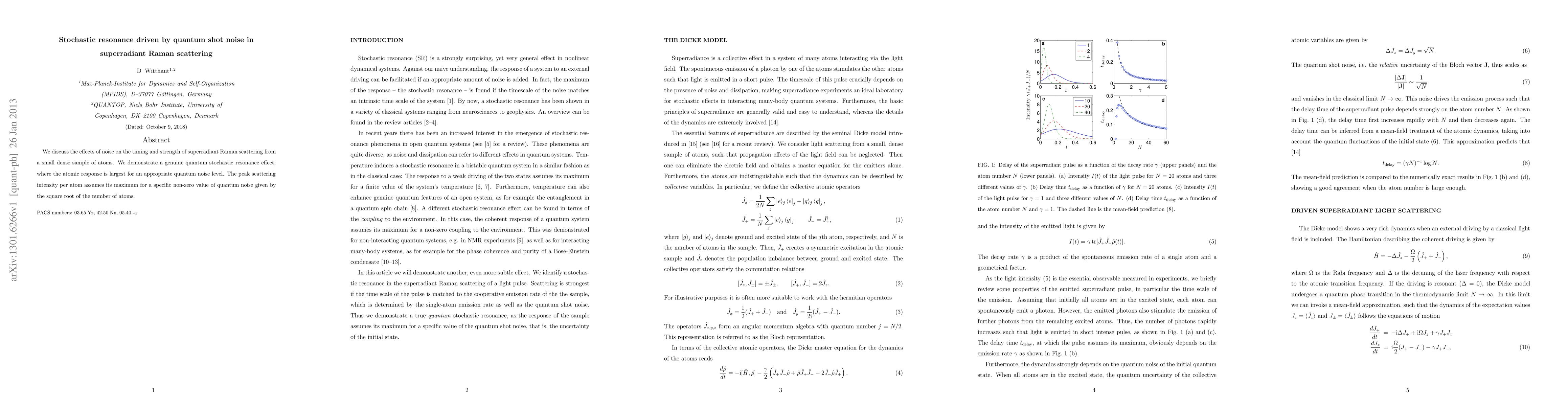 We discuss the effects of noise on the timing and strength of superradiant Raman scattering from a small dense sample of atoms. We demonstrate a genuine quantum stochastic resonance effect, where the atomic response is largest for an appropriate quantum noise level. The peak scattering intensity per atom assumes its maximum for a specific non-zero value of quantum noise given by the square root of the number of atoms.