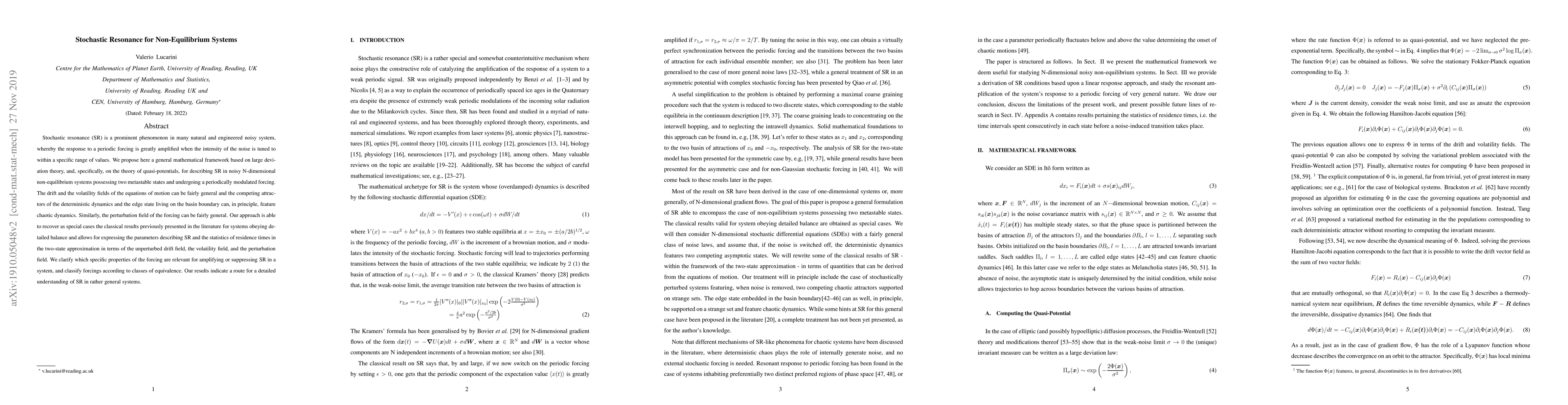 Stochastic resonance (SR) is a prominent phenomenon in many natural and engineered noisy system, whereby the response to a periodic forcing is greatly amplified when the intensity of the noise is tuned to within a specific range of values. We propose here a general mathematical framework based on large deviation theory, and, specifically, on the theory of quasi-potentials, for describing SR in noisy N-dimensional non-equilibrium systems possessing two metastable states and undergoing a periodically modulated forcing. The drift and the volatility fields of the equations of motion can be fairly general and the competing attractors of the deterministic dynamics and the edge state living on the basin boundary can, in principle, feature chaotic dynamics. Similarly, the perturbation field of the forcing can be fairly general. Our approach is able to recover as special cases the classical results previously presented in the literature for systems obeying detailed balance and allows for expressing the parameters describing SR and the statistics of residence times in the two-state approximation in terms of the unperturbed drift field, the volatility field, and the perturbation field. We clarify which specific properties of the forcing are relevant for amplifying or suppressing SR in a system, and classify forcings according to classes of equivalence. Our results indicate a route for a detailed understanding of SR in rather general systems.