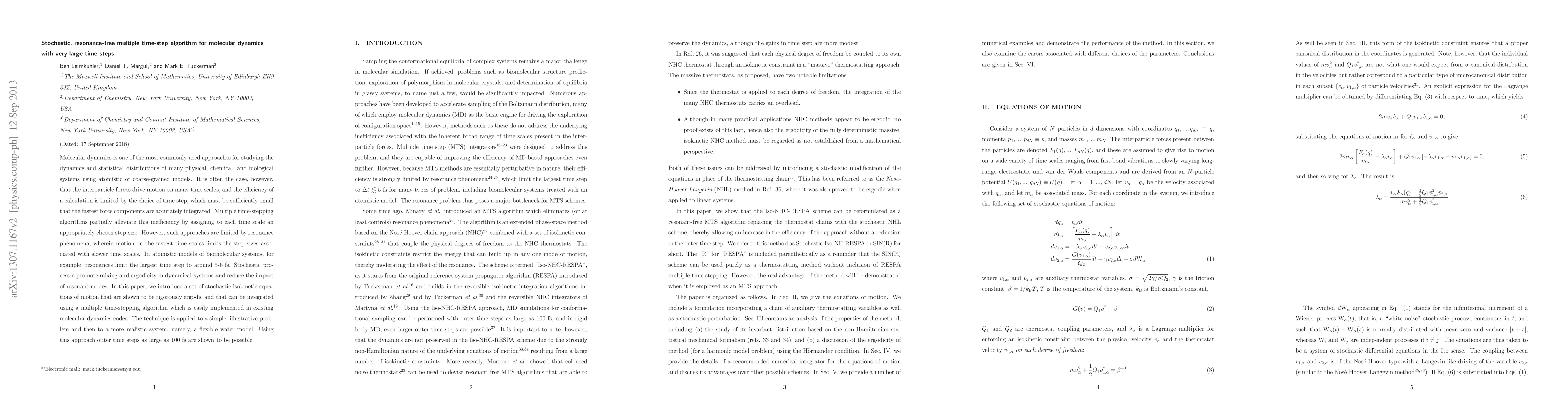 This paper introduces a stochastic resonance-free multiple time-step algorithm for molecular dynamics, enabling the use of very large time steps (up to 100 fs) without resonance limitations. The method employs stochastic isokinetic equations of motion, which are rigorously ergodic and can be integrated within existing molecular dynamics frameworks.