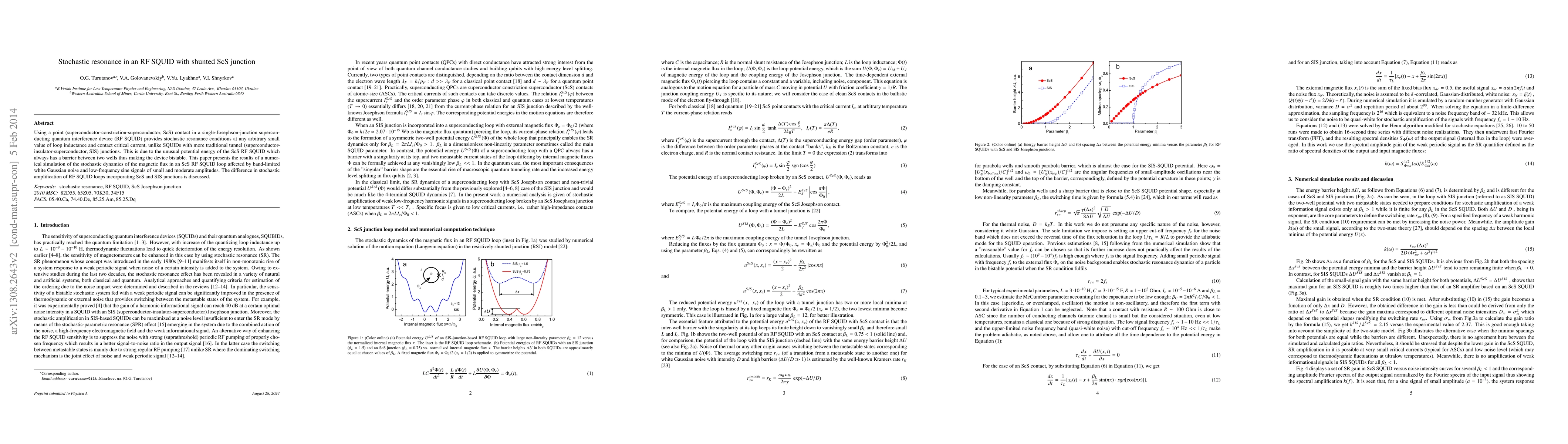 Using a point (superconductor-constriction-superconductor, ScS) contact in a single-Josephson-junction superconducting quantum interference device (RF SQUID) provides stochastic resonance conditions at any arbitrary small value of loop inductance and contact critical current, unlike SQUIDs with more traditional tunnel (superconductor-insulator-superconductor, SIS) junctions. This is due to the unusual potential energy of the ScS RF SQUID which always has a barrier between two wells thus making the device bistable. This paper presents the results of a numerical simulation of the stochastic dynamics of the magnetic flux in an ScS RF SQUID loop affected by band-limited white Gaussian noise and low-frequency sine signals of small and moderate amplitudes. The difference in stochastic amplification of RF SQUID loops incorporating ScS and SIS junctions is discussed.
