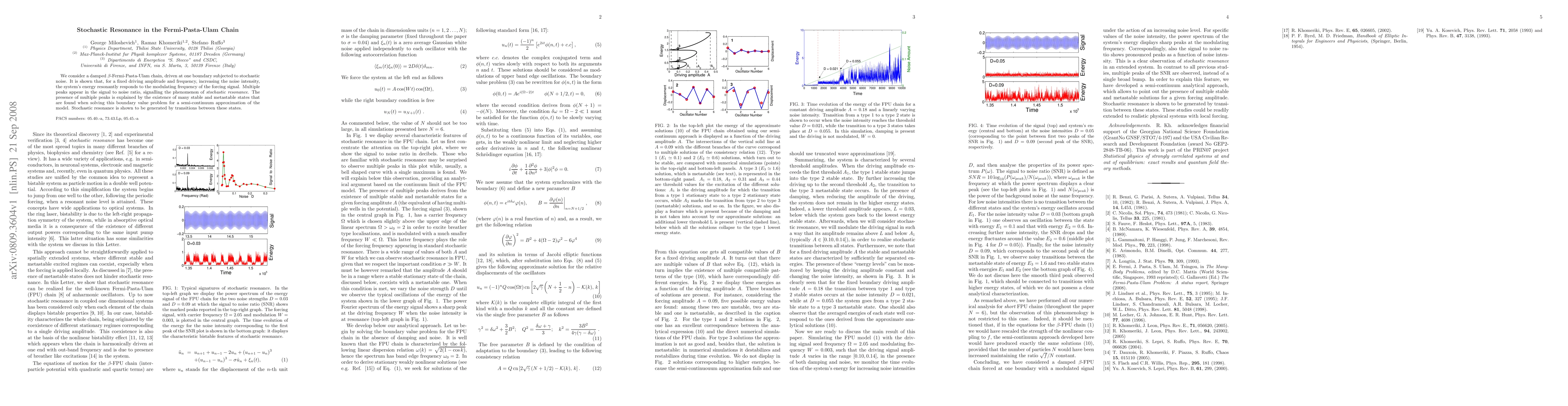 We consider a damped $\beta$-Fermi-Pasta-Ulam chain, driven at one boundary subjected to stochastic noise. It is shown that, for a fixed driving amplitude and frequency, increasing the noise intensity, the system's energy resonantly responds to the modulating frequency of the forcing signal. Multiple peaks appear in the signal to noise ratio, signalling the phenomenon of stochastic resonance. The presence of multiple peaks is explained by the existence of many stable and metastable states that are found when solving this boundary value problem for a semi-continuum approximation of the model. Stochastic resonance is shown to be generated by transitions between these states.