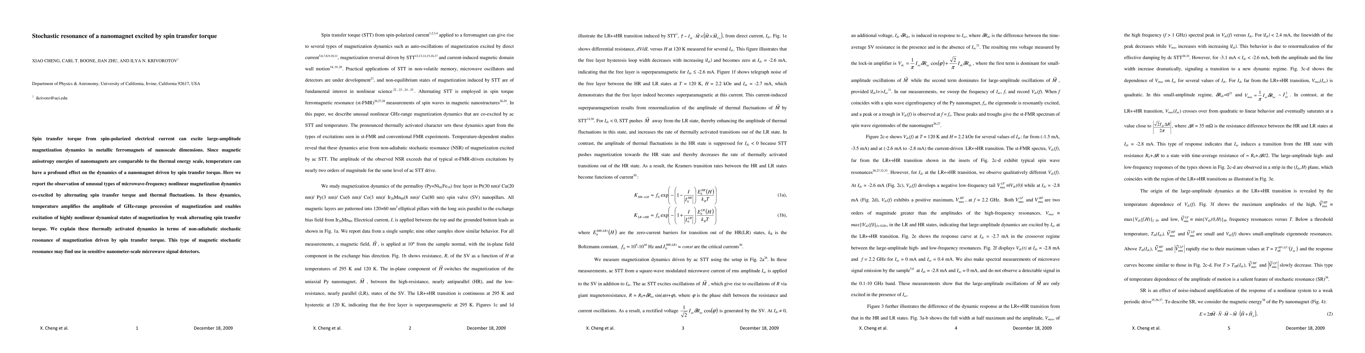 This paper reports on the observation of microwave-frequency nonlinear magnetization dynamics in nanomagnets driven by spin transfer torque and amplified by thermal fluctuations, explaining the phenomenon through non-adiabatic stochastic resonance. Such dynamics could enable highly sensitive nanometer-scale microwave detectors.