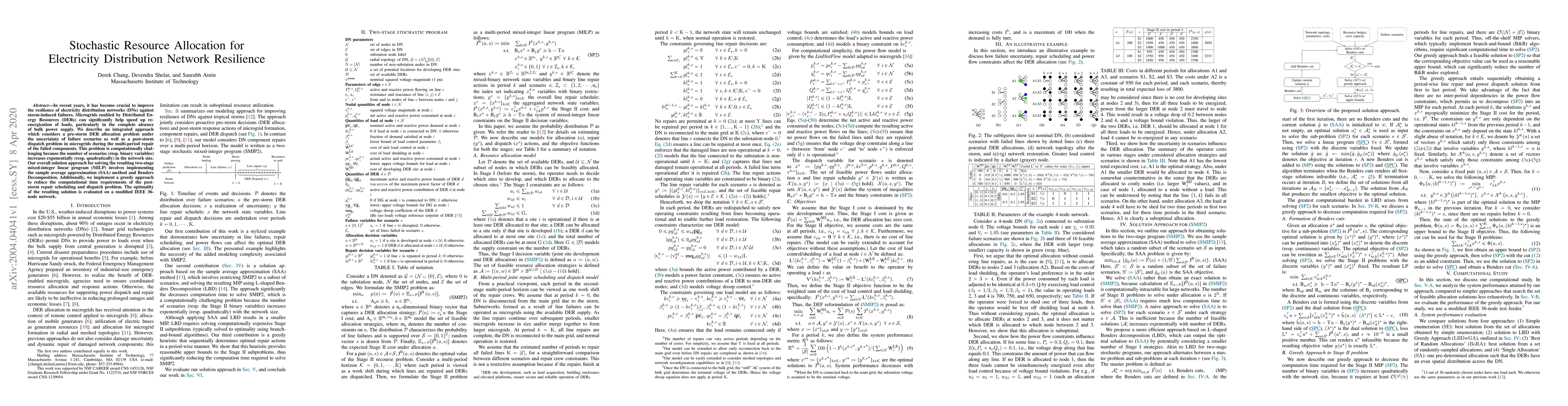 In recent years, it has become crucial to improve the resilience of electricity distribution networks (DNs) against storm-induced failures. Microgrids enabled by Distributed Energy Resources (DERs) can significantly help speed up re-energization of loads, particularly in the complete absence of bulk power supply. We describe an integrated approach which considers a pre-storm DER allocation problem under the uncertainty of failure scenarios as well as a post-storm dispatch problem in microgrids during the multi-period repair of the failed components. This problem is computationally challenging because the number of scenarios (resp. binary variables) increases exponentially (resp. quadratically) in the network size. Our overall solution approach for solving the resulting two-stage mixed-integer linear program (MILP) involves implementing the sample average approximation (SAA) method and Benders Decomposition. Additionally, we implement a greedy approach to reduce the computational time requirements of the post-storm repair scheduling and dispatch problem. The optimality of the resulting solution is evaluated on a modified IEEE 36-node network.