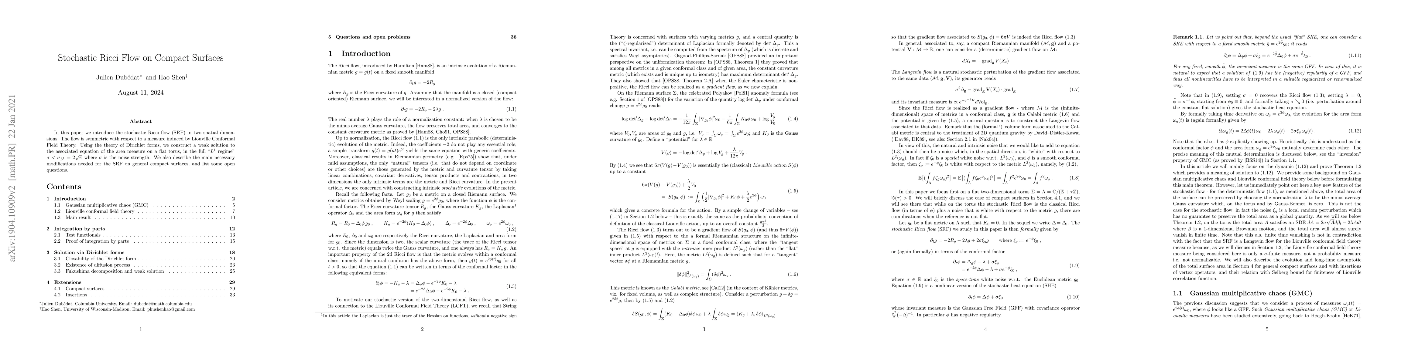 Researchers introduce stochastic Ricci flow on compact surfaces, using Liouville Conformal Field Theory to construct a weak solution for the area measure on flat toruses. The findings provide insights into the dynamics of compact surface geometries under noise-induced perturbations.