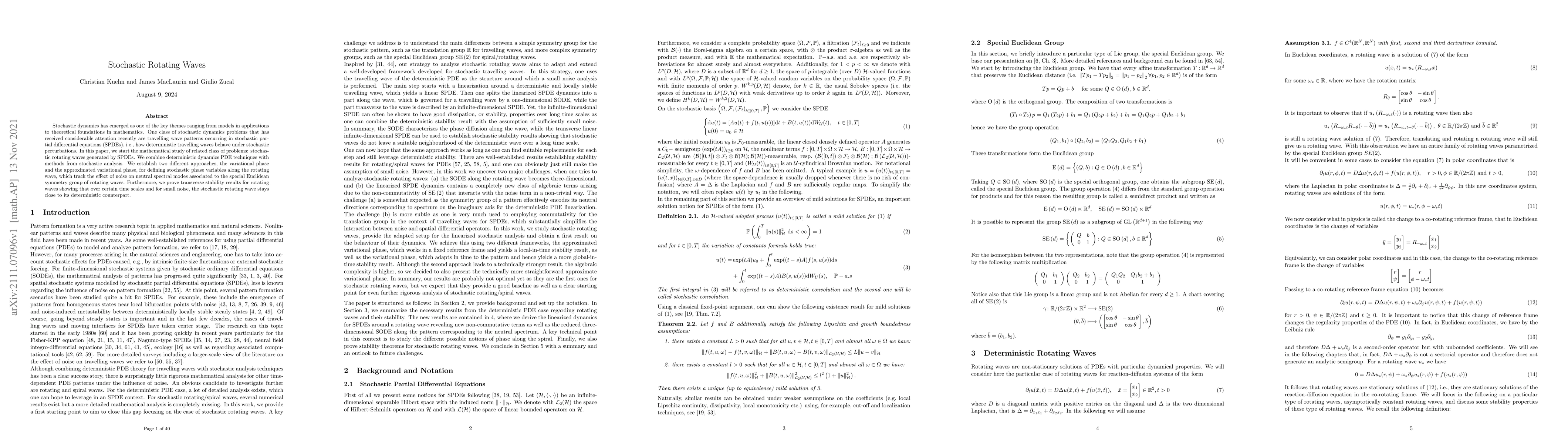 Stochastic dynamics has emerged as one of the key themes ranging from models in applications to theoretical foundations in mathematics. One class of stochastic dynamics problems that has received considerable attention recently are travelling wave patterns occurring in stochastic partial differential equations (SPDEs), i.e., how deterministic travelling waves behave under stochastic perturbations. In this paper, we start the mathematical study of related class of problems: stochastic rotating waves generated by SPDEs. We combine deterministic dynamics PDE techniques with methods from stochastic analysis. We establish two different approaches, the variational phase and the approximated variational phase, for defining stochastic phase variables along the rotating wave, which track the effect of noise on neutral spectral modes associated to the special Euclidean symmetry group of rotating waves. Furthermore, we prove transverse stability results for rotating waves showing that over certain time scales and for small noise, the stochastic rotating wave stays close to its deterministic counterpart.
