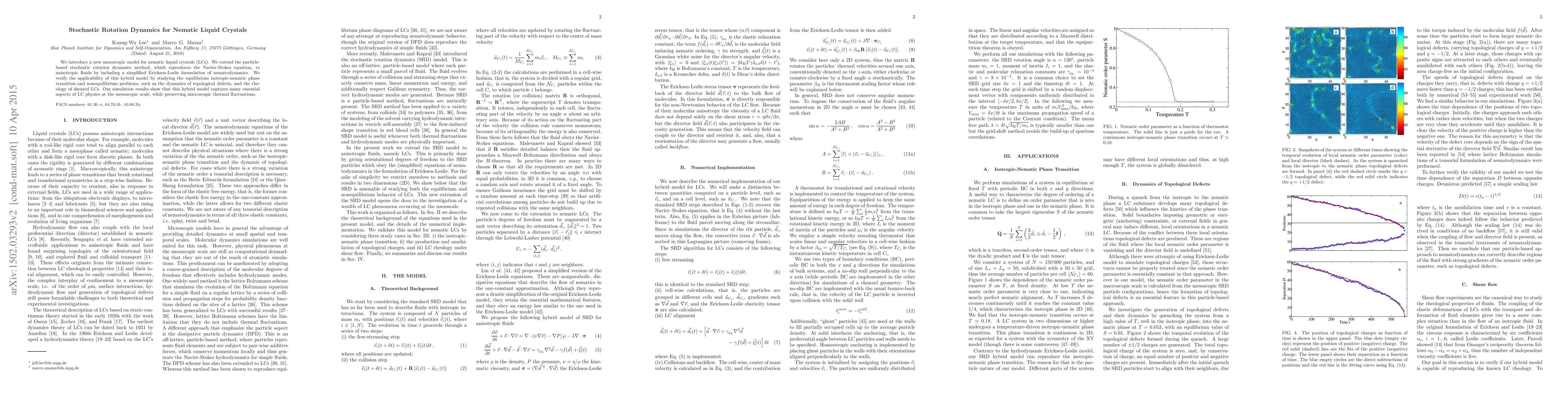 This paper presents a new mesoscopic model for nematic liquid crystals using stochastic rotation dynamics, incorporating an Ericksen-Leslie formulation to simulate anisotropic fluids. The model effectively captures the equilibrium isotropic-nematic phase transition and dynamics of nonequilibrium phenomena, such as defect behavior and shear rheology.