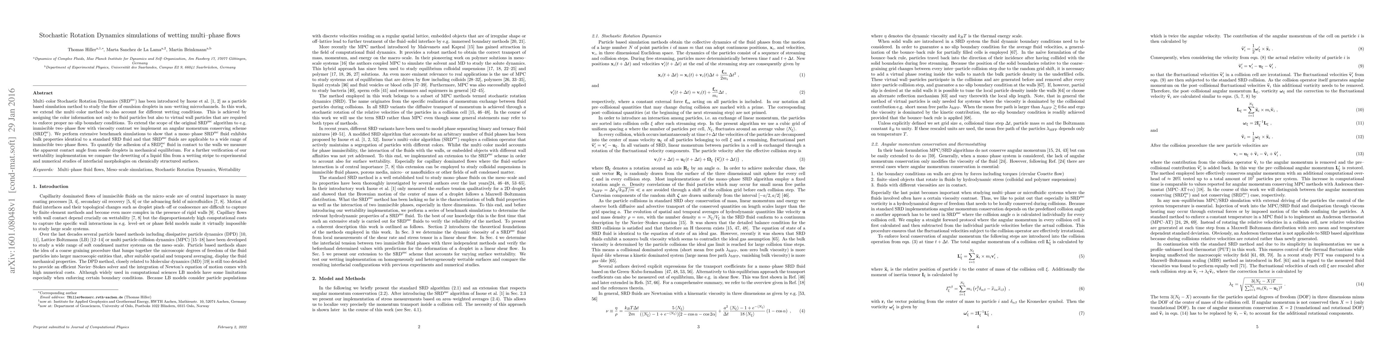 Multi-color Stochastic Rotation Dynamics (SRDmc) has been introduced by Inoue et al. as a particle based simulation method to study the flow of emulsion droplets in non-wetting microchannels. In this work, we extend the multi-color method to also account for different wetting conditions. This is achieved by assigning the color information not only to fluid particles but also to virtual wall particles that are required to enforce proper no-slip boundary conditions. To extend the scope of the original SRDmc algorithm to e.g. immiscible two-phase flow with viscosity contrast we implement an angular momentum conserving scheme (SRDmc+). We perform extensive benchmark simulations to show that a mono-phase SRDmc fluid exhibits bulk properties identical to a standard SRD fluid and that SRDmc fluids are applicable to a wide range of immiscible two-phase flows. To quantify the adhesion of a SRDmc+ fluid in contact to the walls we measure the apparent contact angle from sessile droplets in mechanical equilibrium. For a further verification of our wettability implementation we compare the dewetting of a liquid film from a wetting stripe to experimental and numerical studies of interfacial morphologies on chemically structured surfaces.