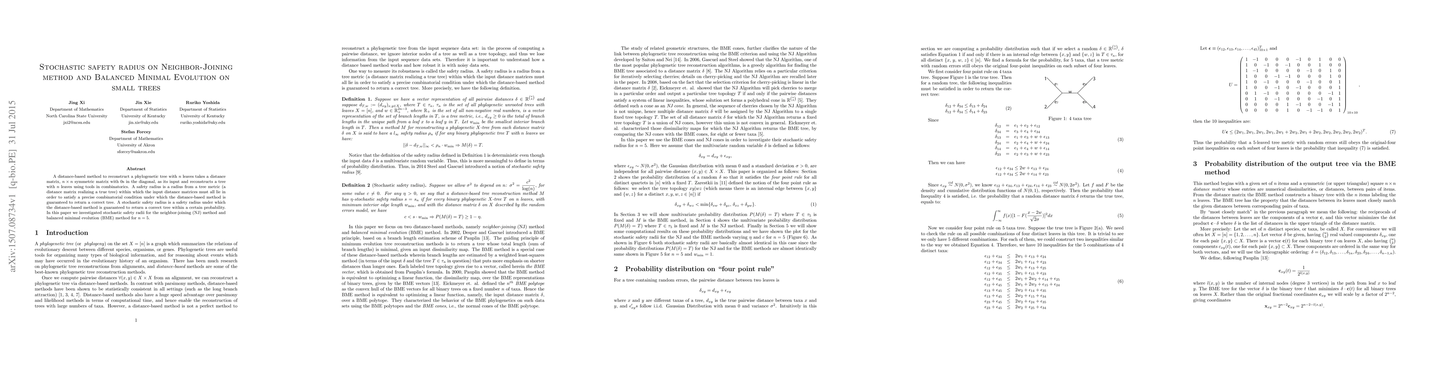 A distance-based method to reconstruct a phylogenetic tree with $n$ leaves takes a distance matrix, $n \times n$ symmetric matrix with $0$s in the diagonal, as its input and reconstructs a tree with $n$ leaves using tools in combinatorics. A safety radius is a radius from a tree metric (a distance matrix realizing a true tree) within which the input distance matrices must all lie in order to satisfy a precise combinatorial condition under which the distance-based method is guaranteed to return a correct tree. A stochastic safety radius is a safety radius under which the distance-based method is guaranteed to return a correct tree within a certain probability. In this paper we investigated stochastic safety radii for the neighbor-joining (NJ) method and balanced minimal evolution (BME) method for $n = 5$.