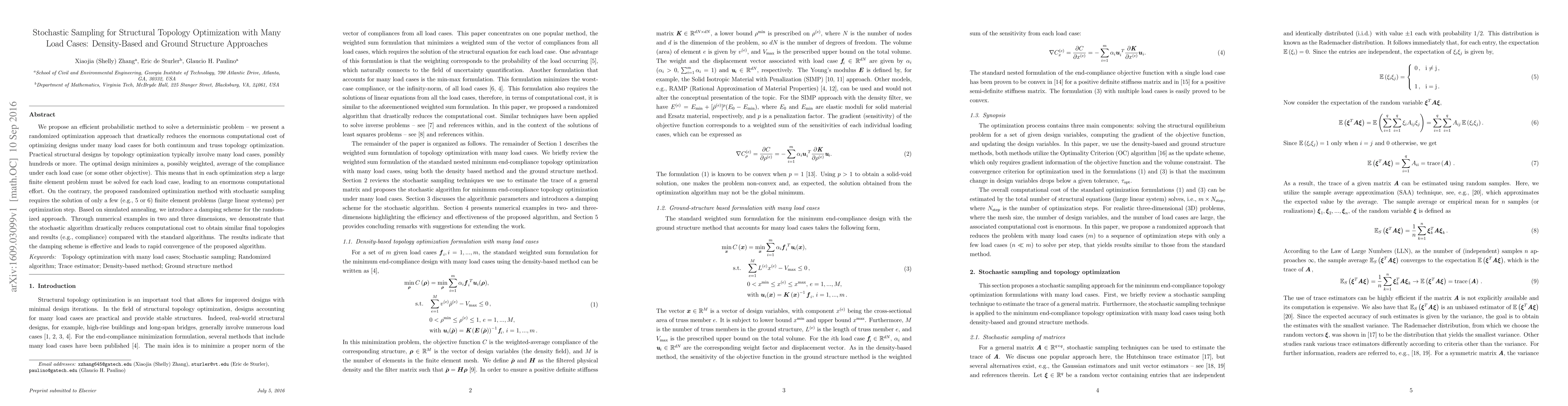 This paper proposes a randomized optimization method using stochastic sampling to significantly reduce computational costs in topology optimization under multiple load cases. The stochastic approach, based on simulated annealing and a damping scheme, requires solving only a few finite element problems per optimization step, achieving similar results with much lower computational effort compared to standard methods.