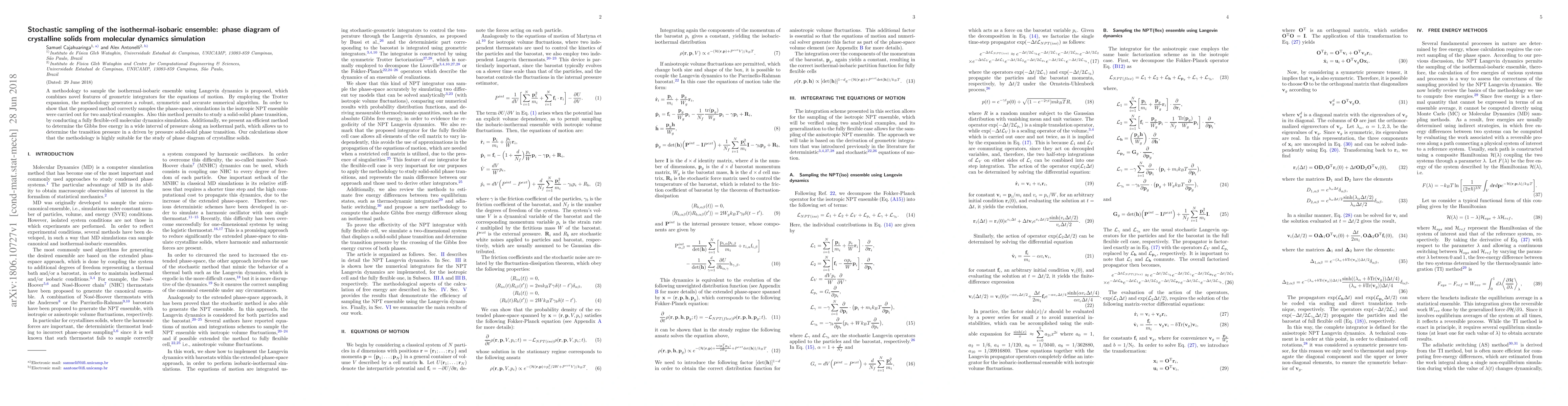 A methodology to sample the isothermal-isobaric ensemble using Langevin dynamics is proposed, which combines novel features of geometric integrators for the equations of motion. By employing the Trotter expansion, the methodology generates a robust, symmetric and accurate numerical algorithm. In order to show that the proposed method correctly samples the phase-space, simulations in the isotropic NPT ensemble were carried out for two analytical examples. Also this method permits to study a solid-solid phase transition, by conducting a fully flexible-cell molecular dynamics simulation. Additionally, we present an efficient method to determine the Gibbs free energy in a wide interval of pressure along an isothermal path, which allows us to determine the transition pressure in a driven by pressure solid-solid phase transition. Our calculations show that the methodology is highly suitable for the study of phase diagram of crystalline solids.