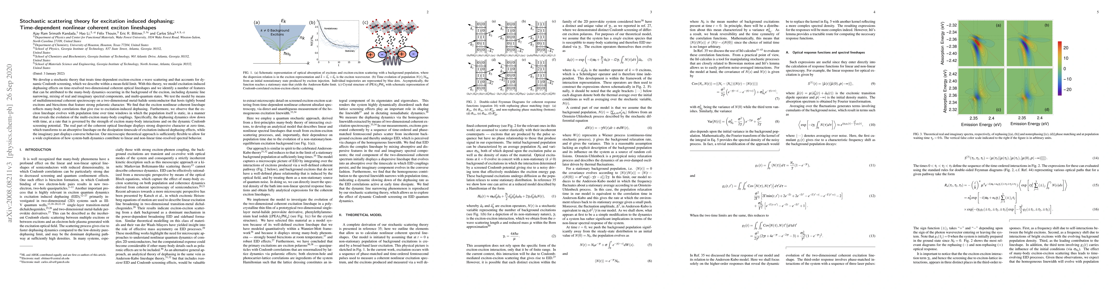 This paper develops a stochastic theory for time-dependent exciton-exciton scattering, accounting for dynamic Coulomb screening, to model excitation-induced dephasing in coherent optical lineshapes. The study reveals many-body dynamics features like line narrowing and multi-quantum states, validated through multidimensional spectroscopy on a metal-halide semiconductor.