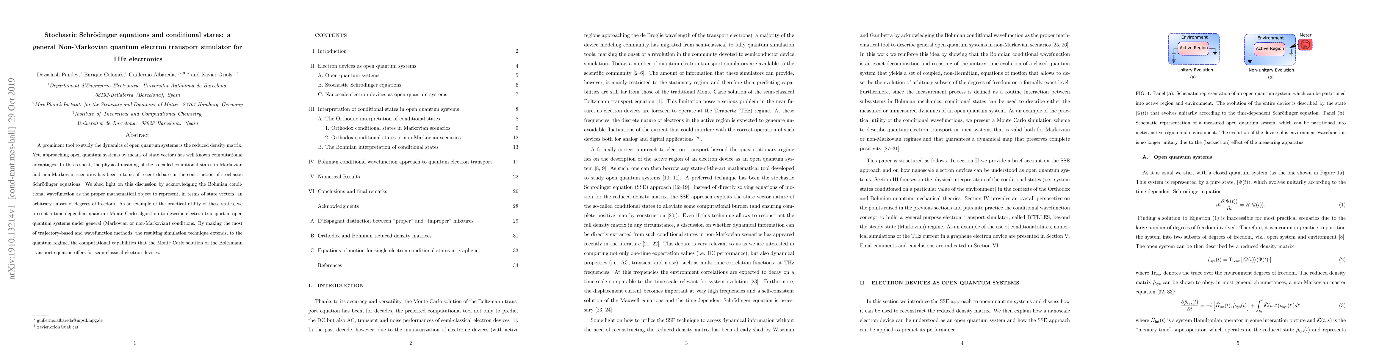This paper proposes a novel quantum electron transport simulator for THz electronics using stochastic Schrödinger equations and conditional states. It leverages Bohmian conditional wavefunctions to represent subsets of degrees of freedom, enabling a time-dependent quantum Monte Carlo algorithm for simulating electron transport under both Markovian and non-Markovian conditions.
