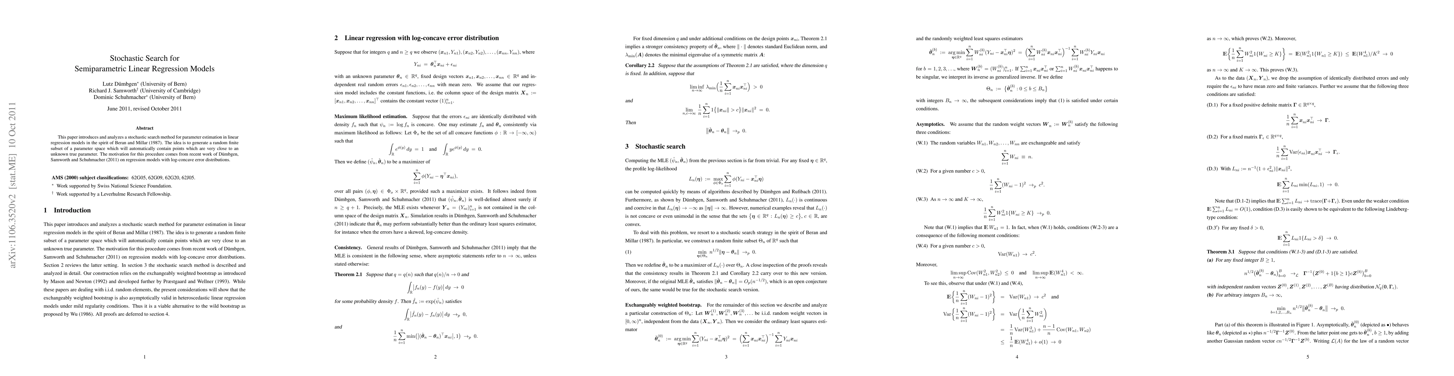 This paper introduces and analyzes a stochastic search method for parameter estimation in linear regression models in the spirit of Beran and Millar (1987). The idea is to generate a random finite subset of a parameter space which will automatically contain points which are very close to an unknown true parameter. The motivation for this procedure comes from recent work of Duembgen, Samworth and Schuhmacher (2011) on regression models with log-concave error distributions.