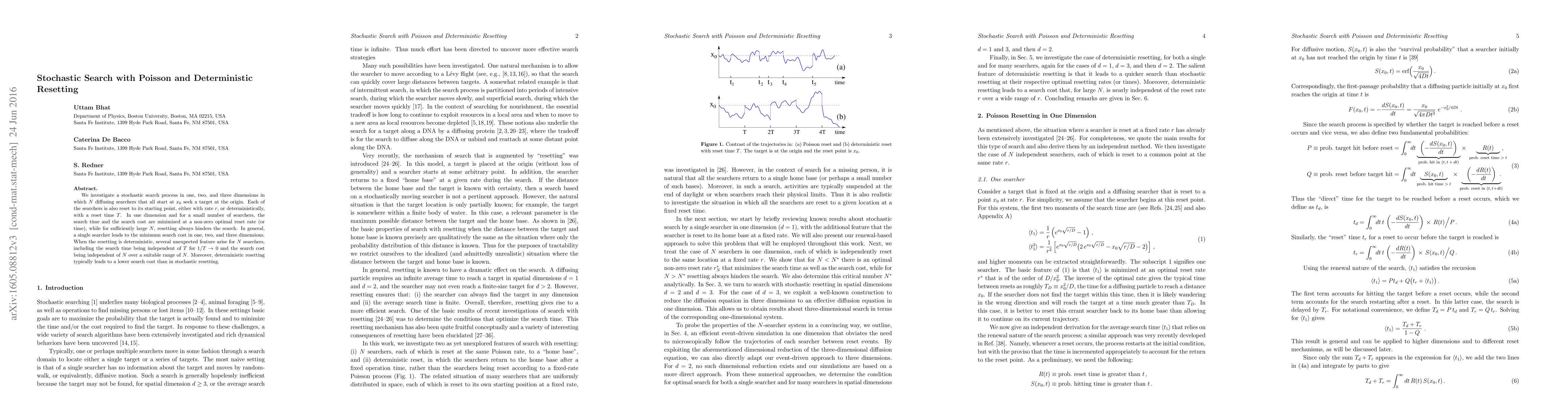 This paper explores a stochastic search process where $N$ searchers reset either randomly or deterministically, finding that optimal reset rates minimize search time and cost for small $N$ in one dimension, while large $N$ is hindered by resetting. Deterministic resetting reveals unexpected features, such as search time independence from reset time and search cost independence from $N$ in certain ranges.