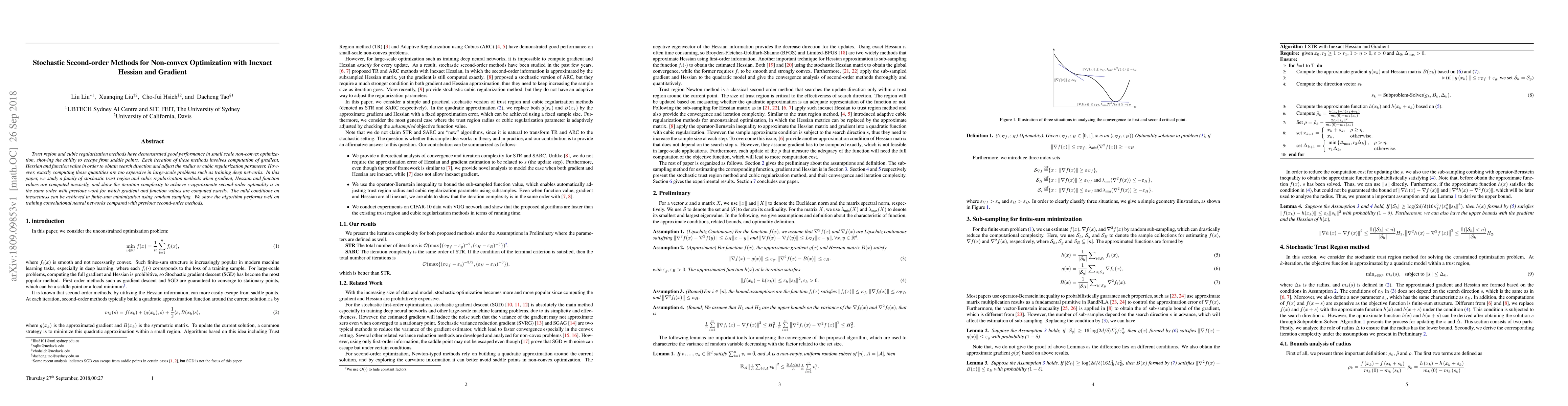 Trust region and cubic regularization methods have demonstrated good performance in small scale non-convex optimization, showing the ability to escape from saddle points. Each iteration of these methods involves computation of gradient, Hessian and function value in order to obtain the search direction and adjust the radius or cubic regularization parameter. However, exactly computing those quantities are too expensive in large-scale problems such as training deep networks. In this paper, we study a family of stochastic trust region and cubic regularization methods when gradient, Hessian and function values are computed inexactly, and show the iteration complexity to achieve $\epsilon$-approximate second-order optimality is in the same order with previous work for which gradient and function values are computed exactly. The mild conditions on inexactness can be achieved in finite-sum minimization using random sampling. We show the algorithm performs well on training convolutional neural networks compared with previous second-order methods.