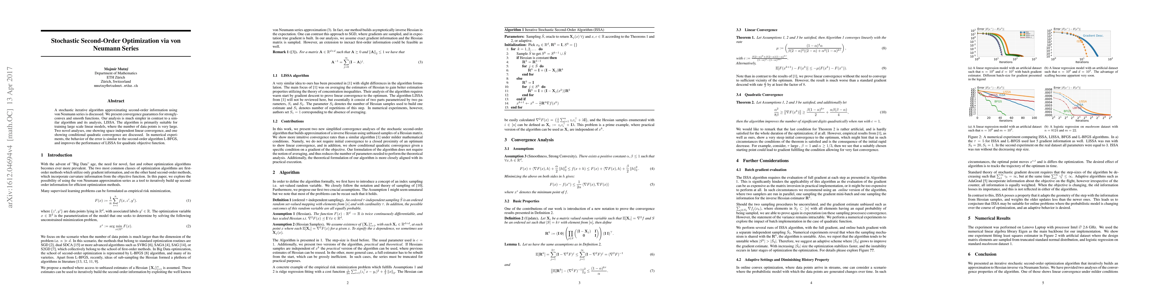 A stochastic iterative algorithm approximating second-order information using von Neumann series is discussed. We present convergence guarantees for strongly-convex and smooth functions. Our analysis is much simpler in contrast to a similar algorithm and its analysis, LISSA. The algorithm is primarily suitable for training large scale linear models, where the number of data points is very large. Two novel analyses, one showing space independent linear convergence, and one showing conditional quadratic convergence are discussed. In numerical experiments, the behavior of the error is similar to the second-order algorithm L-BFGS, and improves the performance of LISSA for quadratic objective function.