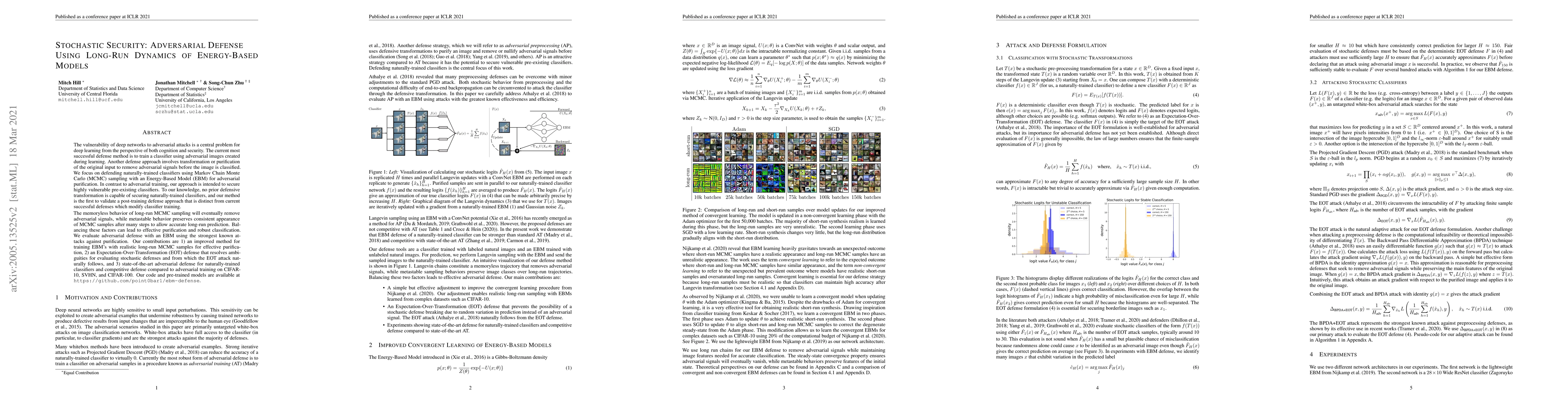The vulnerability of deep networks to adversarial attacks is a central problem for deep learning from the perspective of both cognition and security. The current most successful defense method is to train a classifier using adversarial images created during learning. Another defense approach involves transformation or purification of the original input to remove adversarial signals before the image is classified. We focus on defending naturally-trained classifiers using Markov Chain Monte Carlo (MCMC) sampling with an Energy-Based Model (EBM) for adversarial purification. In contrast to adversarial training, our approach is intended to secure pre-existing and highly vulnerable classifiers. The memoryless behavior of long-run MCMC sampling will eventually remove adversarial signals, while metastable behavior preserves consistent appearance of MCMC samples after many steps to allow accurate long-run prediction. Balancing these factors can lead to effective purification and robust classification. We evaluate adversarial defense with an EBM using the strongest known attacks against purification. Our contributions are 1) an improved method for training EBM's with realistic long-run MCMC samples, 2) an Expectation-Over-Transformation (EOT) defense that resolves theoretical ambiguities for stochastic defenses and from which the EOT attack naturally follows, and 3) state-of-the-art adversarial defense for naturally-trained classifiers and competitive defense compared to adversarially-trained classifiers on Cifar-10, SVHN, and Cifar-100. Code and pre-trained models are available at https://github.com/point0bar1/ebm-defense.