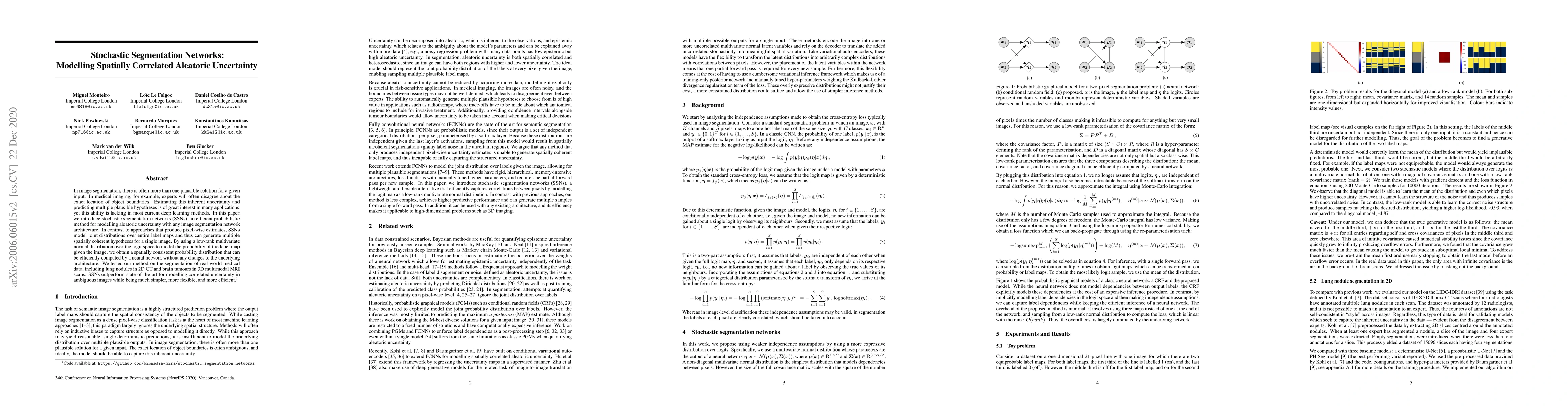 This paper introduces stochastic segmentation networks (SSNs) to model aleatoric uncertainty in image segmentation, generating multiple plausible segmentations for ambiguous inputs. SSNs use a low-rank multivariate normal distribution to efficiently compute spatially coherent probability distributions over entire label maps without altering existing network architectures.