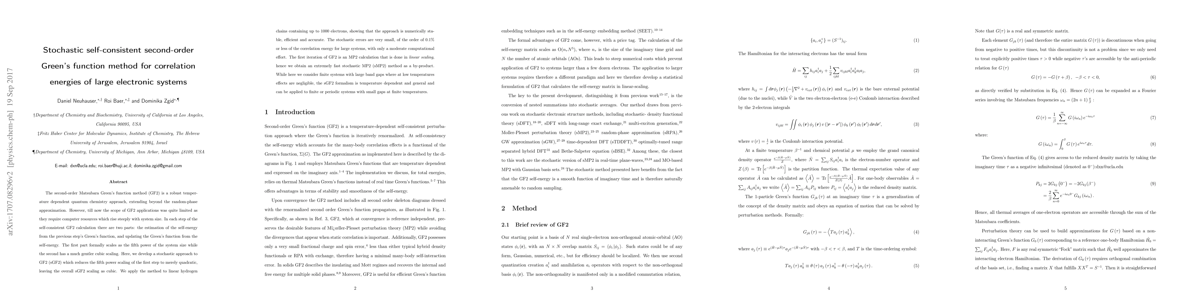 The second-order Matsubara Green's function method (GF2) is a robust temperature dependent quantum chemistry approach, extending beyond the random-phase approximation. However, till now the scope of GF2 applications was quite limited as they require computer resources which rise steeply with system size. In each step of the self-consistent GF2 calculation there are two parts: the estimation of the self-energy from the previous step's Green's function, and updating the Green's function from the self-energy. The first part formally scales as the fifth power of the system size while the second has a much gentler cubic scaling. Here, we develop a stochastic approach to GF2 (sGF2) which reduces the fifth power scaling of the first step to merely quadratic, leaving the overall sGF2 scaling as cubic. We apply the method to linear hydrogen chains containing up to 1000 electrons, showing that the approach is numerically stable, efficient and accurate. The stochastic errors are very small, of the order of 0.1% or less of the correlation energy for large systems, with only a moderate computational effort. The first iteration of GF2 is an MP2 calculation that is done in linear scaling, hence we obtain an extremely fast stochastic MP2 (sMP2) method as a by-product. While here we consider finite systems with large band gaps where at low temperatures effects are negligible, the sGF2 formalism is temperature dependent and general and can be applied to finite or periodic systems with small gaps at finite temperatures.
