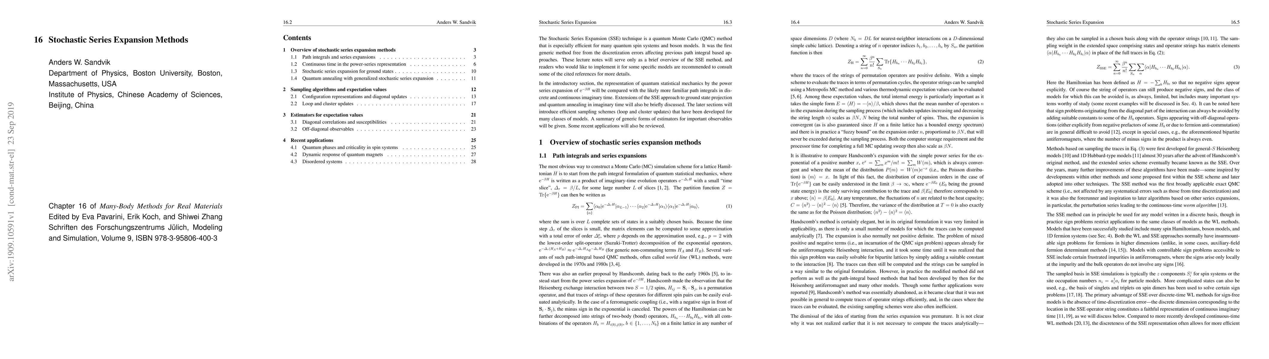 The Stochastic Series Expansion (SSE) method is a quantum Monte Carlo technique effective for quantum spin systems and boson models, free from discretization errors. This paper provides an overview of SSE, comparing it to path integrals, and discusses its applications, sampling schemes, and estimators for important observables.