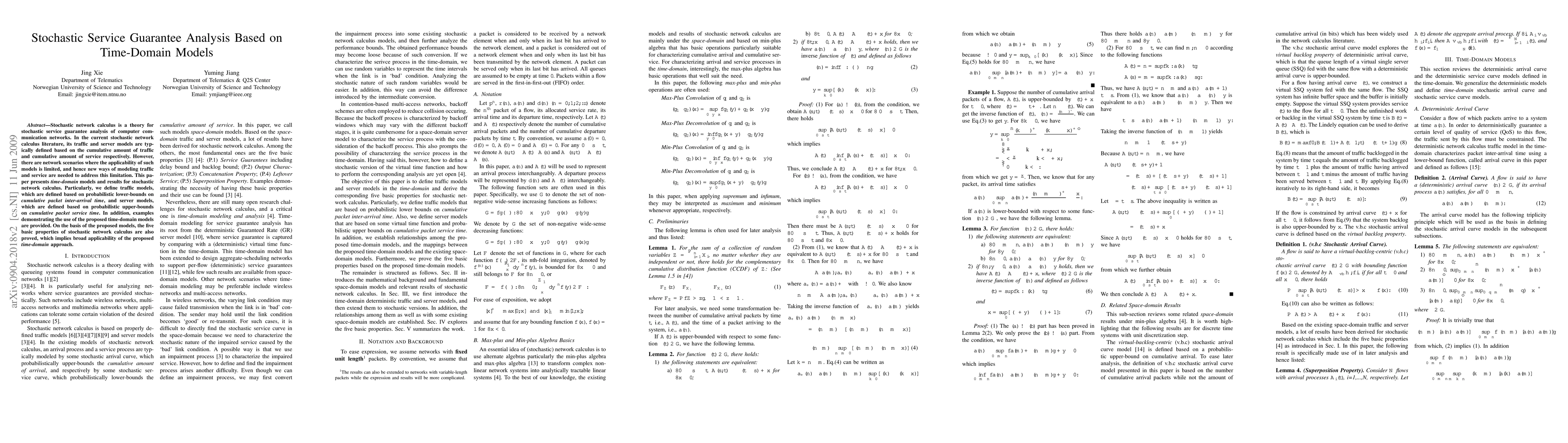 This paper introduces time-domain models for stochastic network calculus, defining traffic based on probabilistic lower-bounds on inter-arrival times and server models based on probabilistic upper-bounds on service times. It demonstrates the broad applicability of these models by proving the five basic properties of stochastic network calculus.