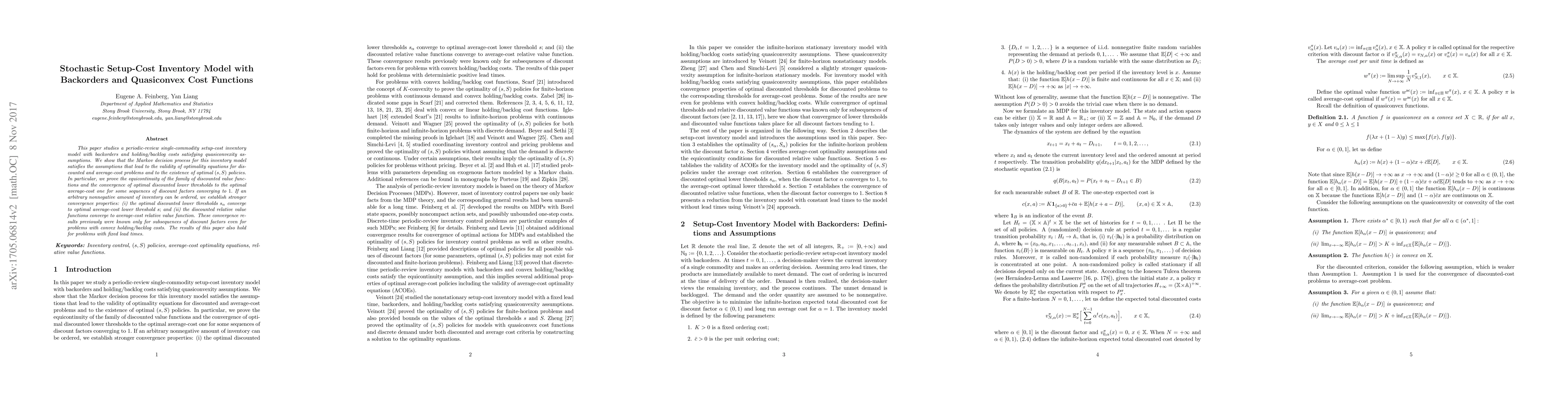 This paper investigates a stochastic inventory model with setup costs, backorders, and quasiconvex cost functions, proving the existence of optimal $(s,S)$ policies and establishing convergence properties for discounted and average-cost problems, extending previous results known only for subsequences of discount factors.