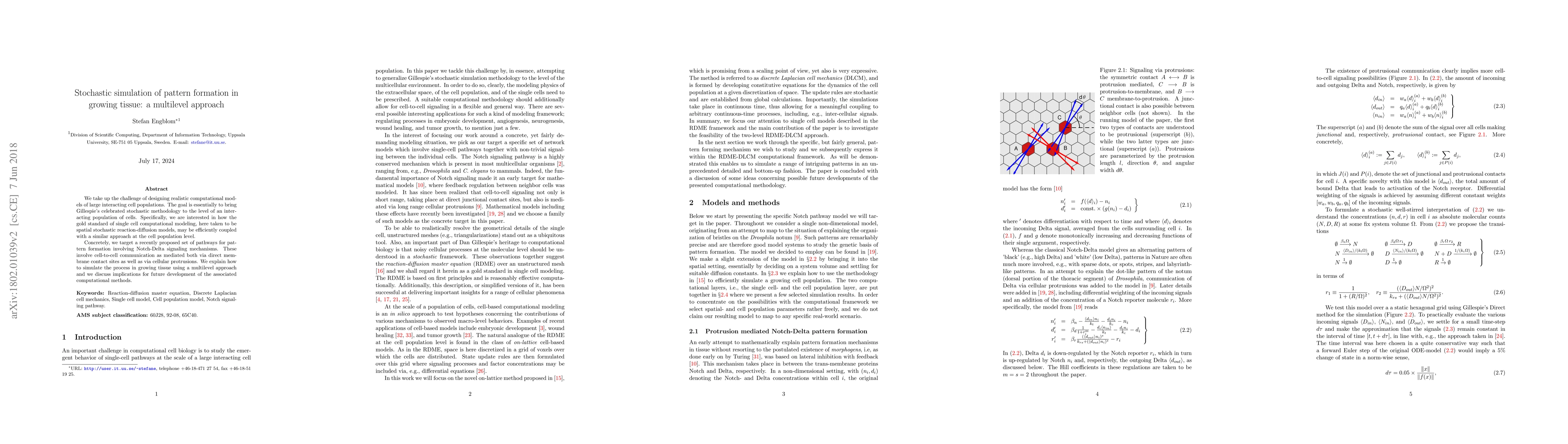 We take up the challenge of designing realistic computational models of large interacting cell populations. The goal is essentially to bring Gillespie's celebrated stochastic methodology to the level of an interacting population of cells. Specifically, we are interested in how the gold standard of single cell computational modeling, here taken to be spatial stochastic reaction-diffusion models, may be efficiently coupled with a similar approach at the cell population level. Concretely, we target a recently proposed set of pathways for pattern formation involving Notch-Delta signaling mechanisms. These involve cell-to-cell communication as mediated both via direct membrane contact sites as well as via cellular protrusions. We explain how to simulate the process in growing tissue using a multilevel approach and we discuss implications for future development of the associated computational methods.