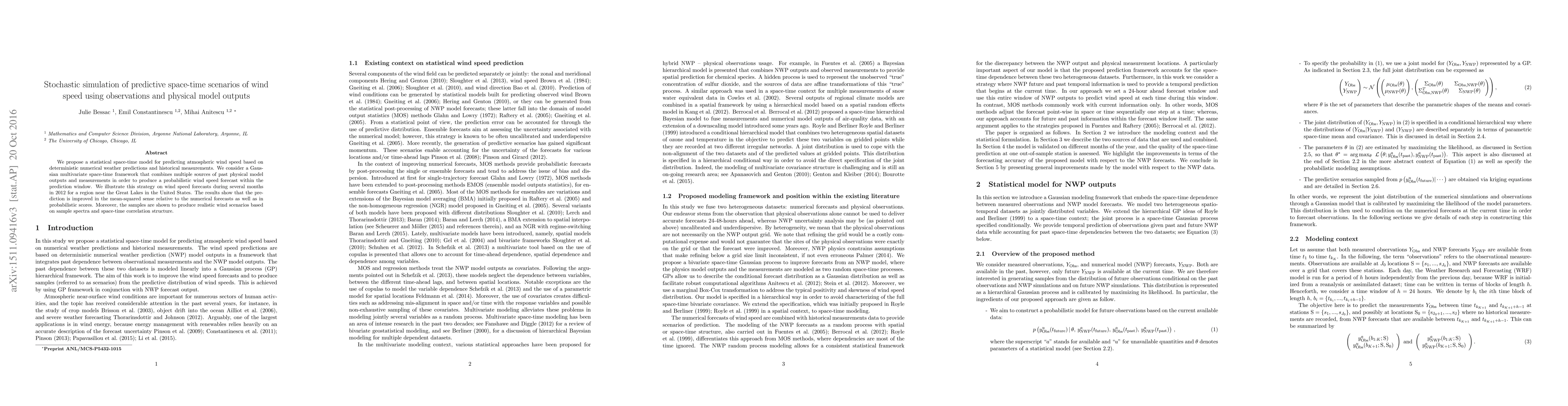 We propose a statistical space-time model for predicting atmospheric wind speed based on deterministic numerical weather predictions and historical measurements. We consider a Gaussian multivariate space-time framework that combines multiple sources of past physical model outputs and measurements along with model predictions in order to produce a probabilistic wind speed forecast within the prediction window. We illustrate this strategy on a ground wind speed forecast for several months in 2012 for a region near the Great Lakes in the United States. The results show that the prediction is improved in the mean-squared sense relative to the numerical forecasts as well as in probabilistic scores. Moreover, the samples are shown to produce realistic wind scenarios based on the sample spectrum.