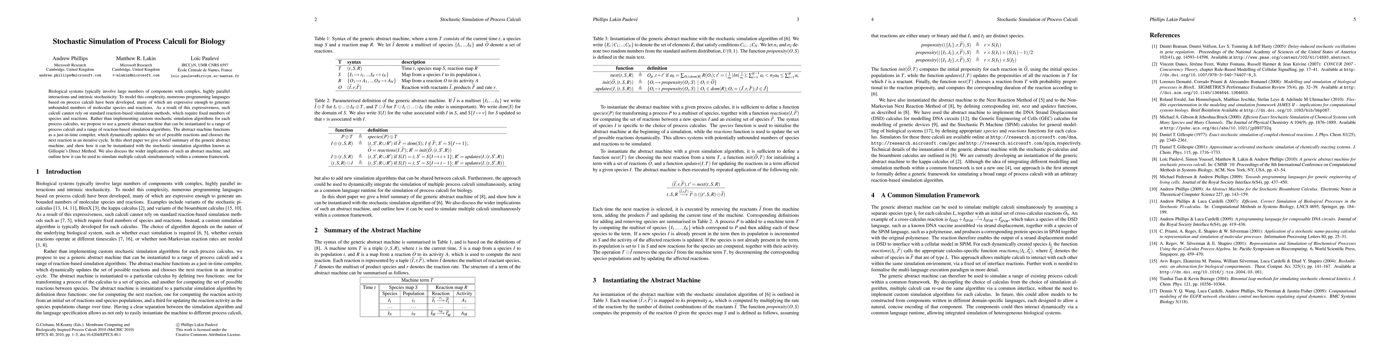 This paper proposes a generic abstract machine to simulate process calculi used in biological modeling, which dynamically updates reaction sets and selects reactions iteratively. It demonstrates the machine's instantiation with Gillespie's Direct Method and discusses its potential to simulate multiple calculi within a unified framework.
