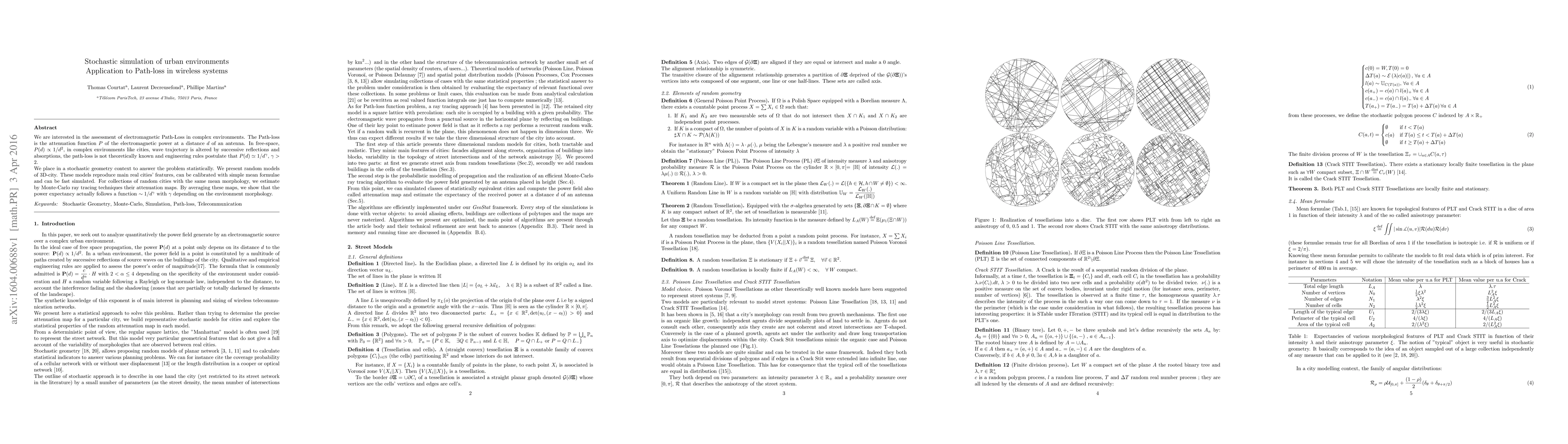 We are interested in the assessment of electromagnetic Path-Loss in complex environments. The Path-loss is the attenuation function $P$ of the electromagnetic power at a distance $d$ of an antenna. In free-space, $P(d) \propto 1/d^2$, in complex environments like cities, wave trajectory is altered by successive reflections and absorptions, the path-loss is not theoretically known and engineering rules postulate that $P(d) \simeq 1/d^{\gamma}, \, \gamma>2$. We place in a stochastic geometry context to answer the problem statistically. We present random models of 3D-city. These models reproduce main real cities' features, can be calibrated with simple mean formulae and can be fast simulated. For collections of random cities with the same mean morphology, we estimate by Monte-Carlo ray tracing techniques their attenuation maps. By averaging these maps, we show that the power expectancy actually follows a function $\sim 1/d^{\gamma}$ with $\gamma$ depending on the environment morphology.