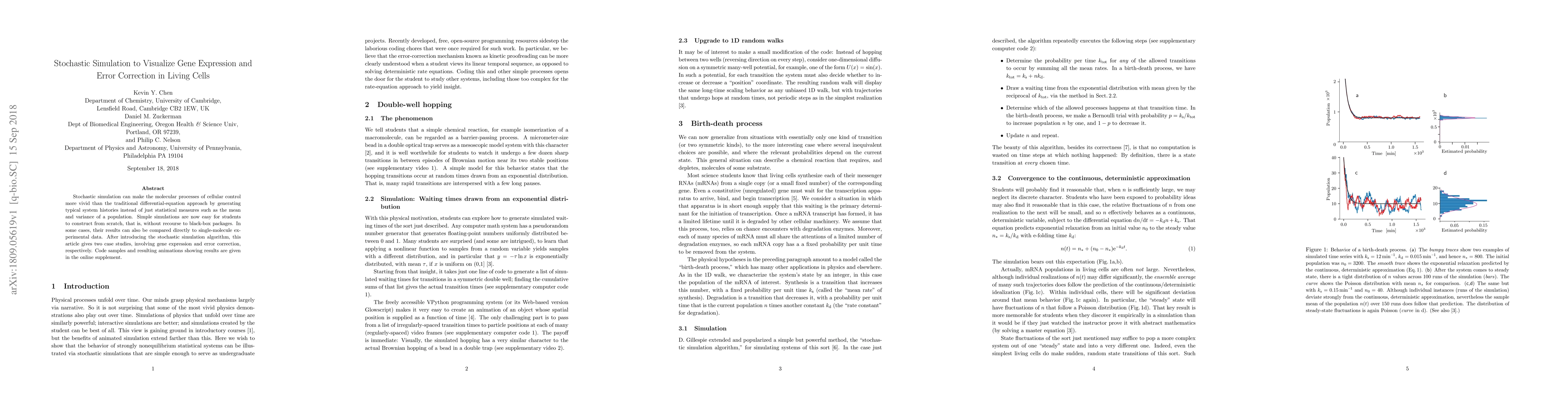 This paper introduces a stochastic simulation method to vividly illustrate gene expression and error correction in living cells, offering a more intuitive alternative to traditional differential-equation models. It provides simple simulation tools for students and includes case studies with animations in the online supplements.