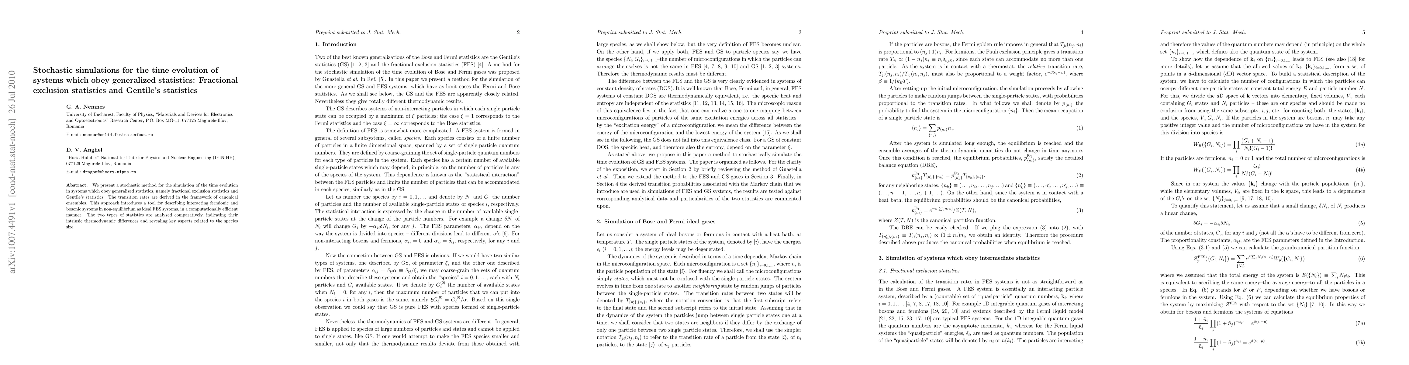 This paper introduces a stochastic simulation method for systems following generalized statistics, specifically fractional exclusion statistics (FES) and Gentile's statistics. It provides a computationally efficient way to describe non-equilibrium interacting fermionic and bosonic systems, and compares the two statistics to highlight their thermodynamic differences and species size implications.