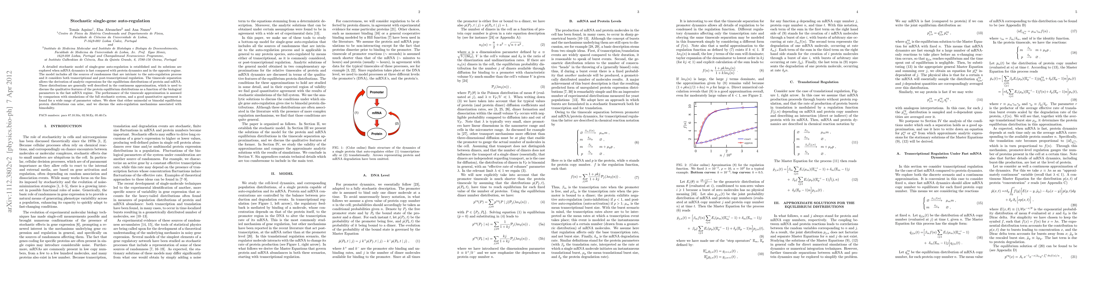 This paper develops a stochastic model for single-gene auto-regulation, exploring mRNA and protein dynamics under different timescales. It finds that equilibrium distributions can be unimodal or bimodal, depending on the regulation mechanisms, and validates the model's accuracy through comparison with full stochastic simulations.